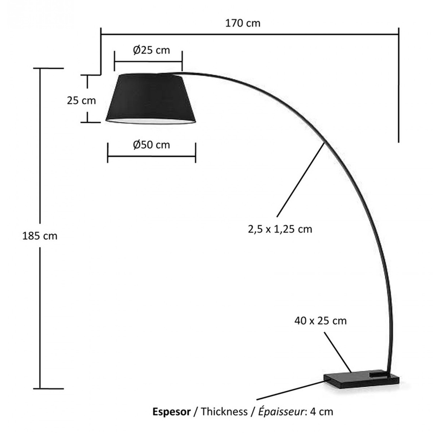 De un tiempo a esta parte se han puesto muy de moda las lámparas de pie con forma de arco. Permiten iluminar zonas y su forma de arco permite que la estructura pueda pasar más desapercibida. CHOPEN es un modelo soberbio. Está diseñada en metal pintado en color negro tomando forma de arco unido a una base rectangular de mármol en el mismo color. Para finalizar, una pantalla de tela en color negro. Disponible el mismo modelo de lámpara CHOPEN acabada en color blanco, para que elijas la que se adapte mejor a tus necesidades. No dudes en llevártela a tu casa.