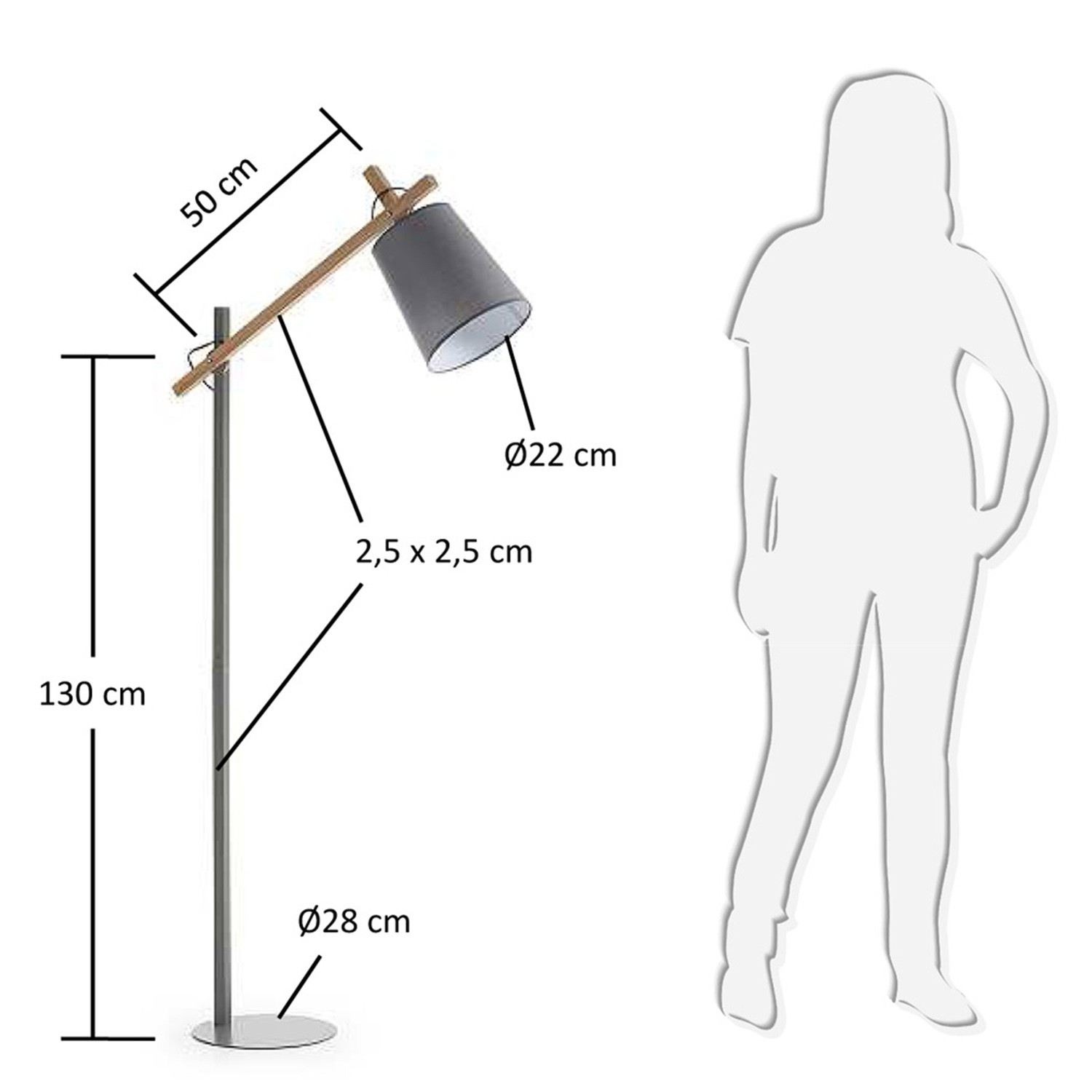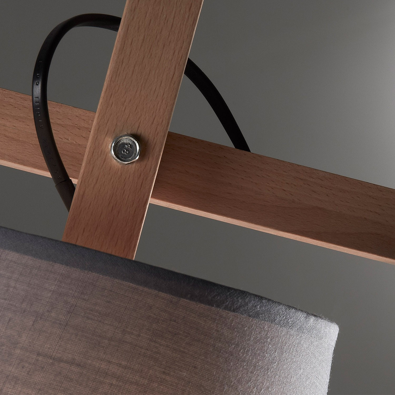 Fabricada en metal de gran calidad y madera de haya, para el pie y brazo y pantalla en tela de algodón para el difusor en un acabado color gris.