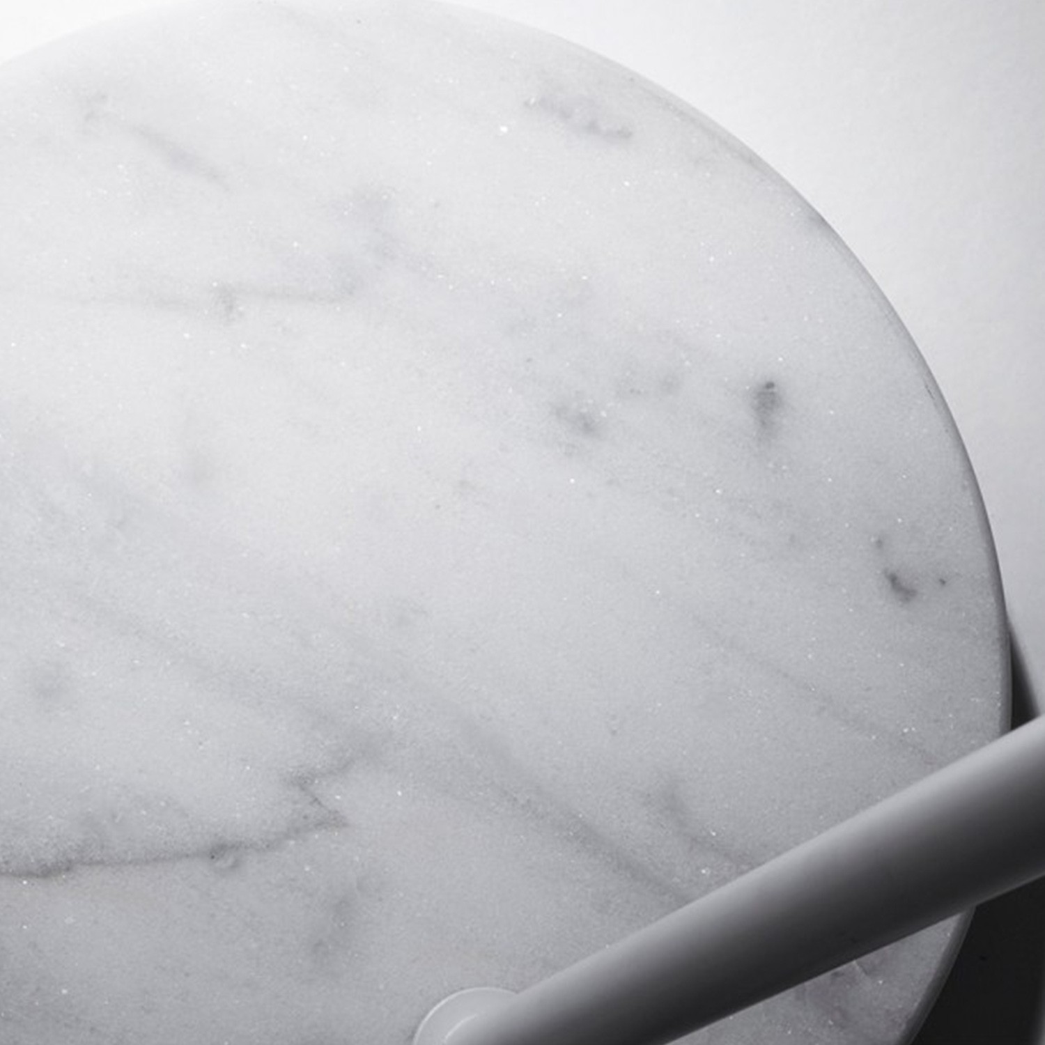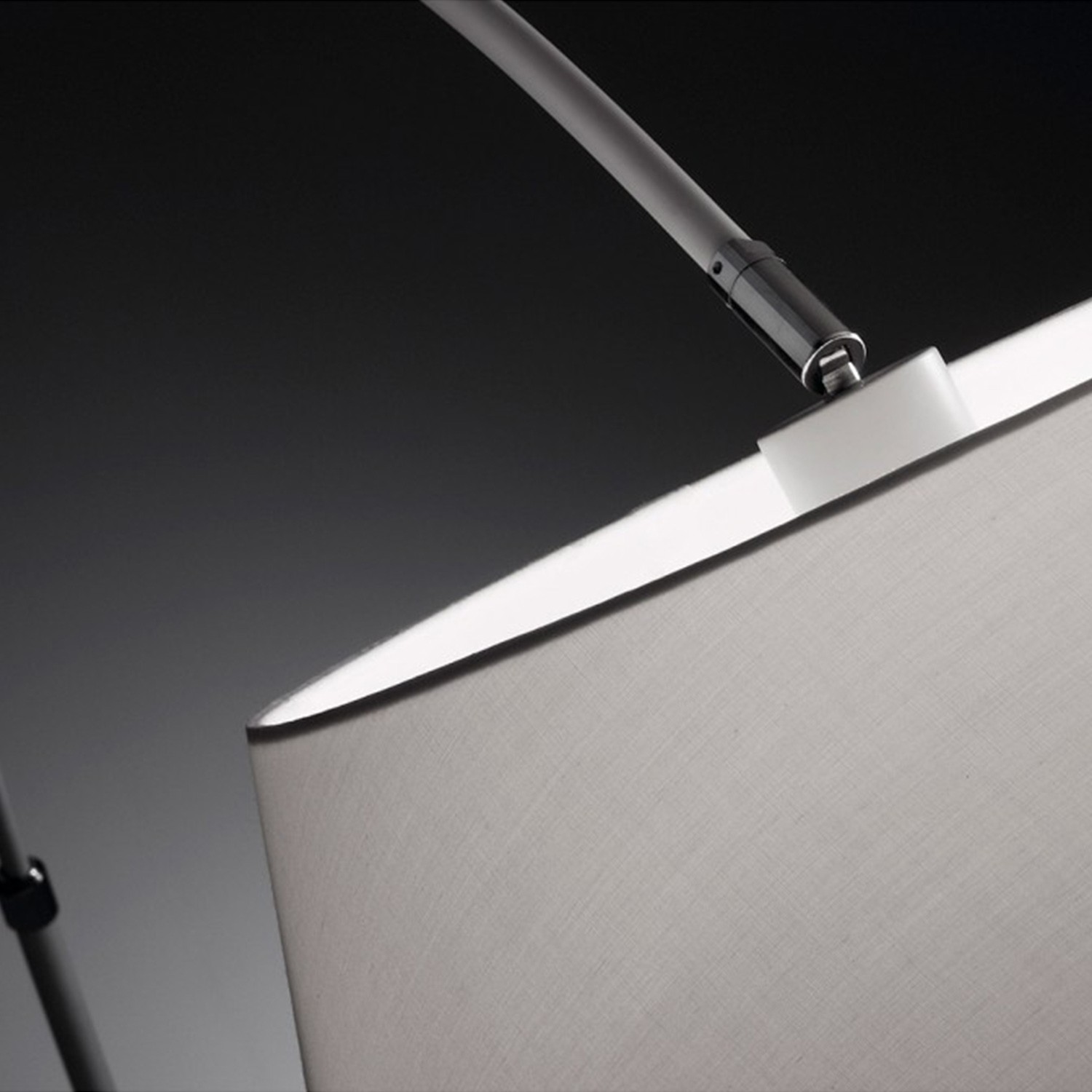 Aquí presentamos LEEN, una lámpara de pie que cuenta con una base de mármol unida a un arco metálico en color blanco que permite regular la altura. Termina con una pantalla de tela en el mismo color.