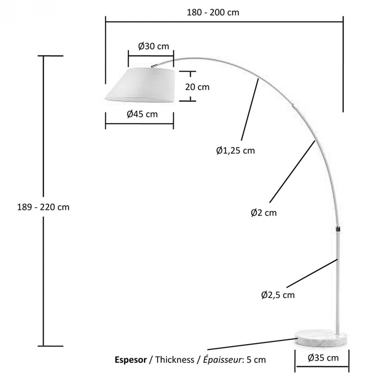 Lámpara de pie LEEN en arco metálico en color blanco. Medidas:  Medida alto: 189-220 cm. Medida ancho: 180-200 cm. Medida profundo: 45 cm. Bombilla: No incluida. Tipo: E-27