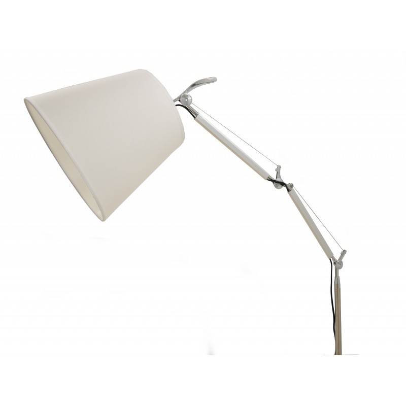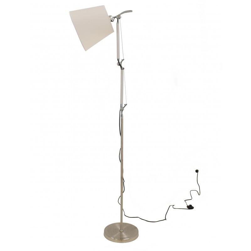 Una extraordinaria lámpara de pie fabricada en aluminio en tono plateado, con distintos brazos articulados. Dispone de pantalla en tejido de color blanco crudo de 30 cm de diámetro. La puedes amoldar en la posición que necesites por ser basculante, gracias a su movilidad, así que con su brazo podrás colocar la luz donde prefieras.