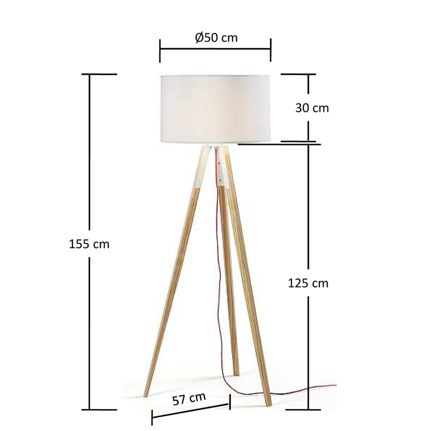 Lampara UZAGI con pie de madera y pantalla blanca de tela resistente, de estilo nórdico. Medidas: Medida alto: 155 cm. Medida ancho: 50 cm. Medida profundo: 50 cm. Bombilla: No incluida. Tipo: E27 1 MAX 40W