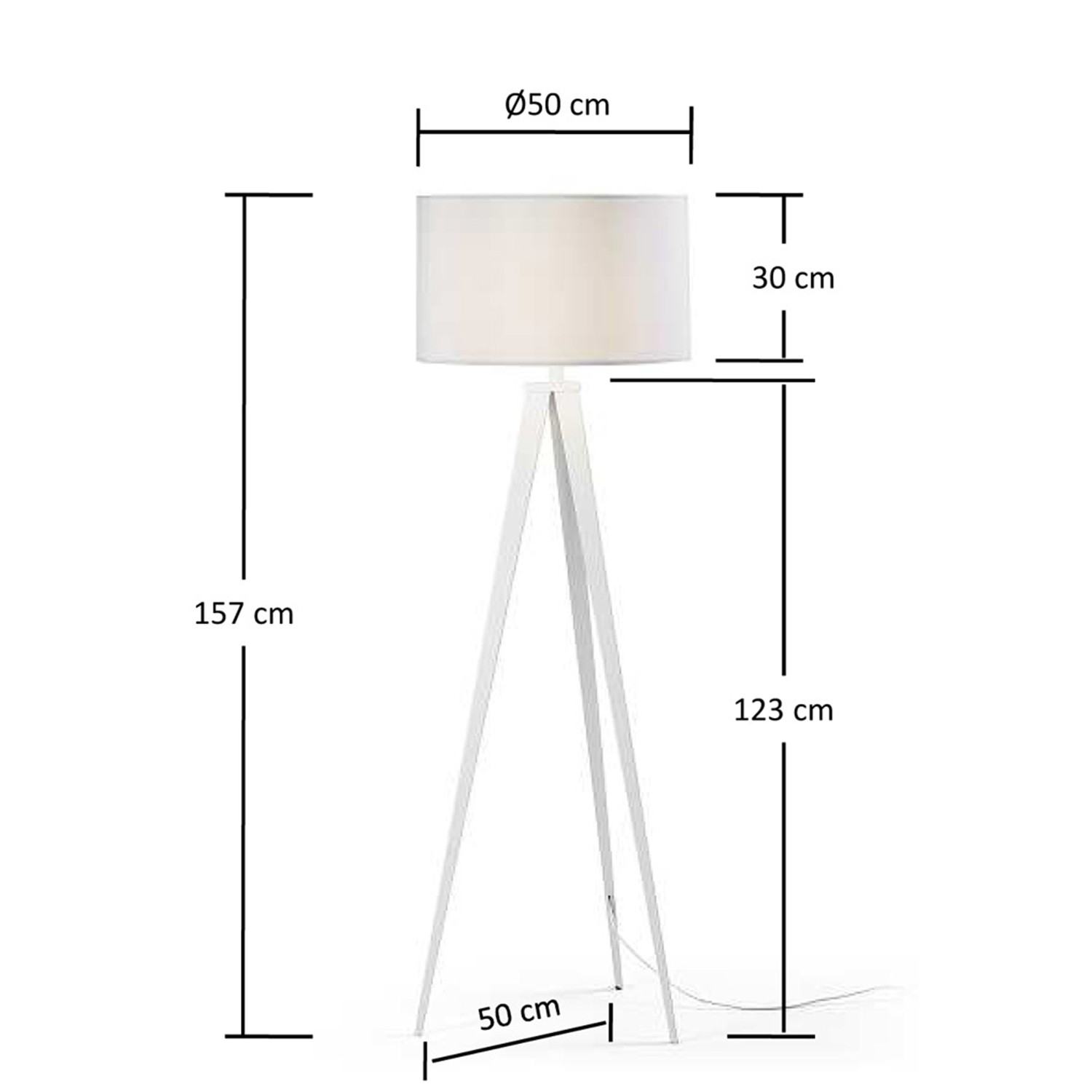 Lámpara de pie UZAGI de pie metálico lacado en blanco y pantalla de tela también en color blanco. Medidas:  Medida alto: 157 cm. Medida ancho: 50 cm. Medida profundo: 50 cm. Bombilla: No incluida. Tipo: E-27