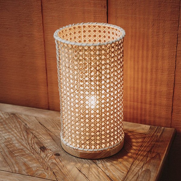 Lámpara de sobremesa KAHUKU fabricada en rejilla de ratán natural y madera.