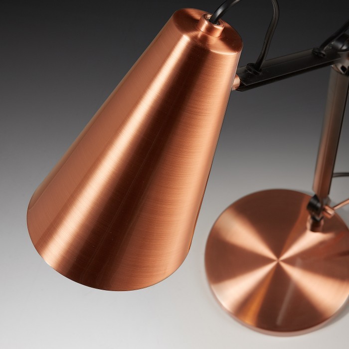 Y un buen ejemplo nos llega con la lámpara de sobremesa LUCEYO. Se trata de un modelo de estilo industrial, puesto que la totalidad de la lámpara es de metal. Tanto la base como la pantalla están acabadas en color cobre, mientras que el brazo, articulado para poder ajustar la iluminación, es de color negro.