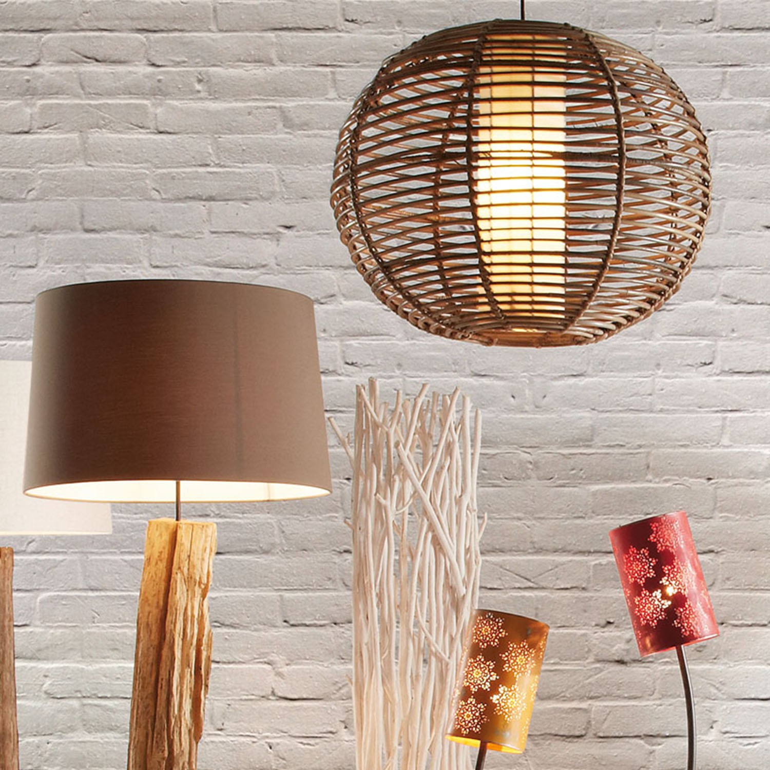 Se trata de un modelo de lámpara de suspensión con una pantalla interior alargada diseñada en tela en color blanco. Recubriendo esta, otra pantalla, esta en bambú en forma redonda, creando un ambiente cálido y agradable.