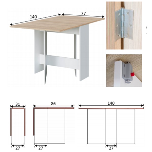 Mesa abatible AILE 31(86/140)x77 – melamina Roble y Blanco