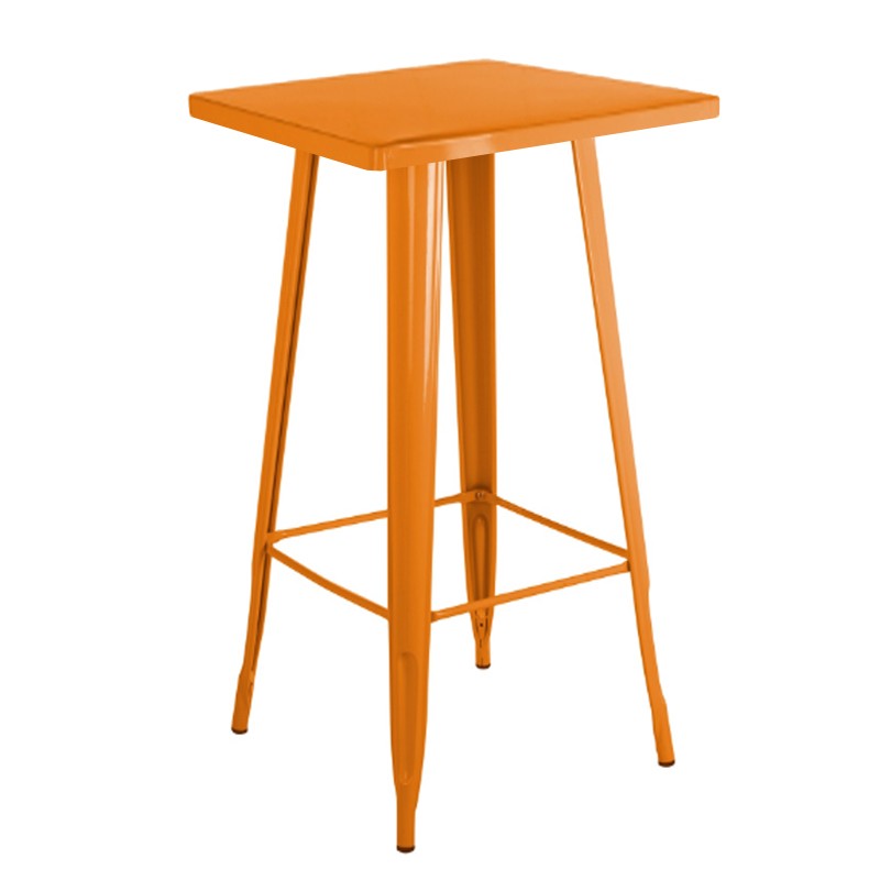 Fabricada en en acero lacado en color naranja, con tablero cuadrado de 60x60 cm, un color vibrante y lleno de energía, un foco de atención para los comensales. Una mesa de alta resistencia y durabilidad para el uso de cada día.