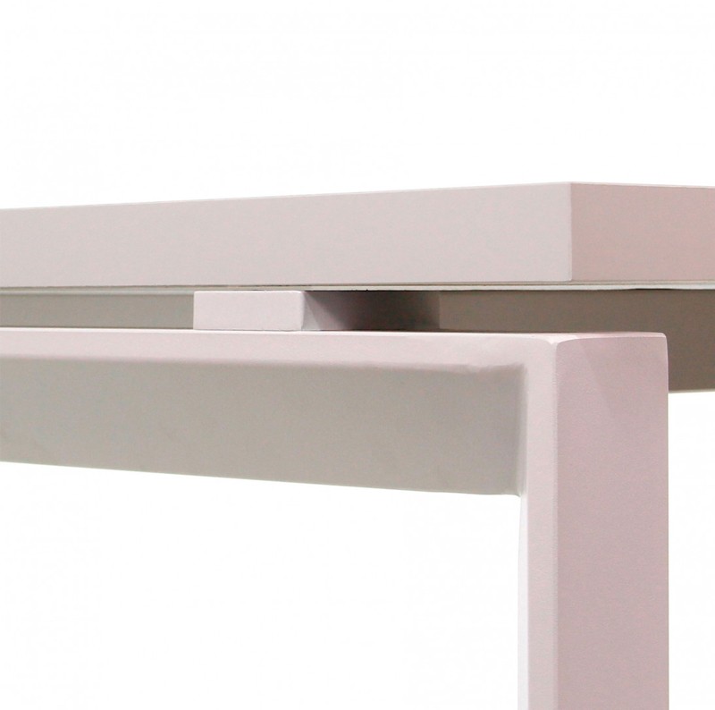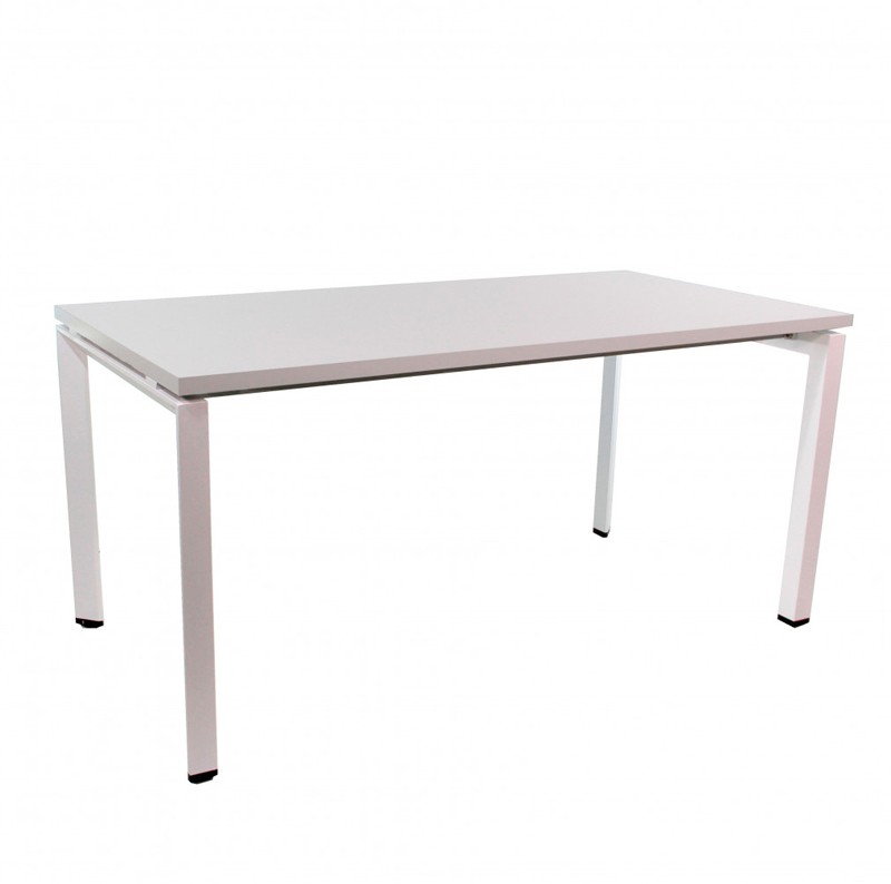Para la fabricación del tablero se ha empleado melamina de alta calidad EGGER acabada en color blanco, la estructura es de acero también en color blanco. Las patas tienen una forma de U invertida, cada una de ellas posee un regulador de altura para ajustar la mesa según se prefiera.