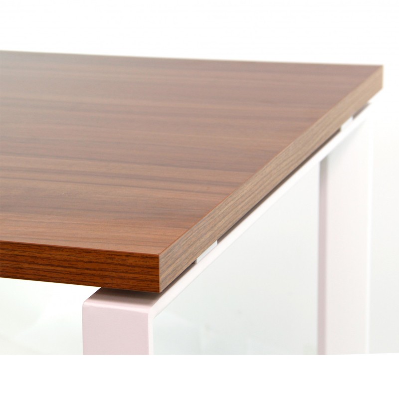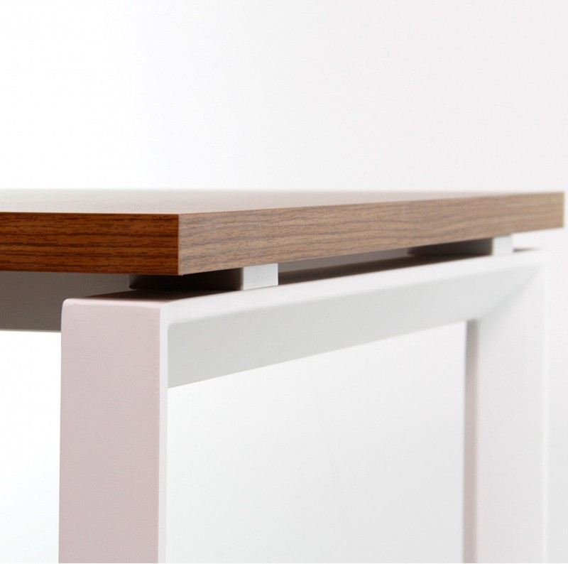 Para la fabricación del sobre, se ha empleado melamina de alta calidad EGGER con un acabado en madera de nogal. La estructura es de acero en color blanco, las patas tienen forma de U invertida y disponen de un regulador para ajustar la altura.