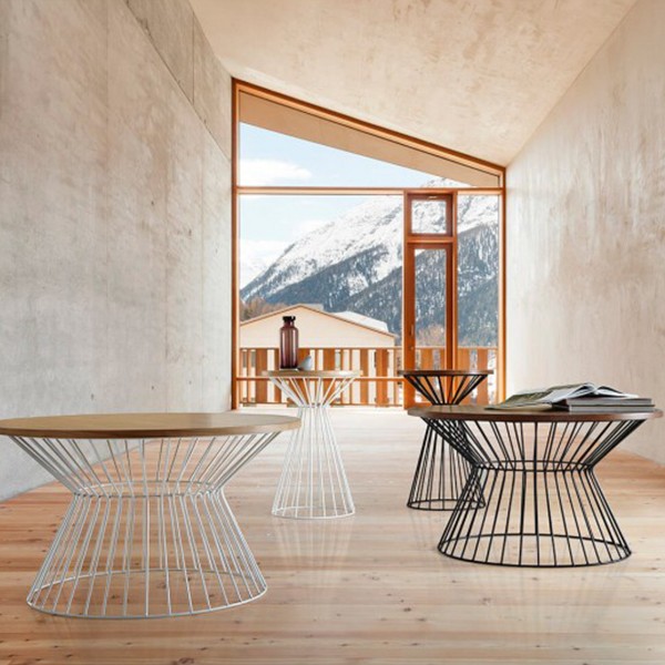 Productos como la mesa auxiliar ANTADA, una mesa de 55 centímetros de altura, compuesta por un sobre de 40 centímetros de diámetro realizado mediante chapa de madera en acabado de color nogal, acompañado por una estructura a modo de jaula, con forma de reloj solar, estrecha en su parte central y ancha en su parte superior e inferior y realizada mediante varillas metálicas en color blanco.