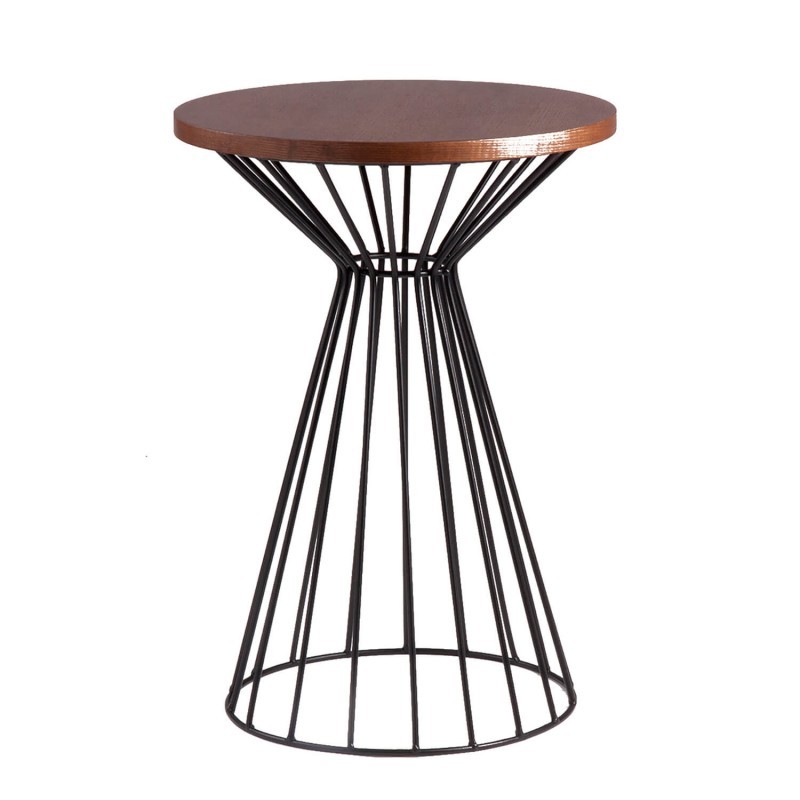 Hoy lo que traemos es la mesa auxiliar ANTADA. Se trata de un modelo de 55 centímetros de altura, formada por una gran estructura, ancha tanto en su parte superior como en la inferior, y más estrecha en su parte central. Dicha estructura ha sido realizada mediante varillas de metal con acabado en color blanco. Finaliza con un sobre redondo, de 40 cm de diámetro y diseñado en madera con acabado en color roble.