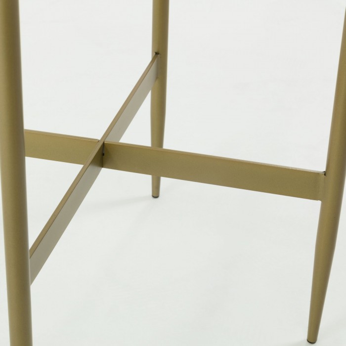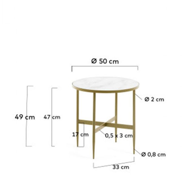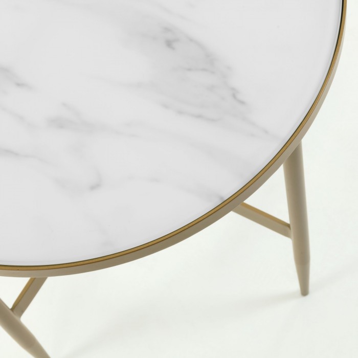 Y no puede haber mejor modelo que la mesa auxiliar BABIA, un modelo redondo, de 50 centímetros de diámetro y formado por un sobre de vidrio que incorpora una lámina que simula al mármol y que le da un acabado mucho más elegante. Este sobre se sostiene mediante cuatro patas de metal en color dorado, y reforzadas entre sí gracias a una cruceta que le aporta mayor estabilidad.
