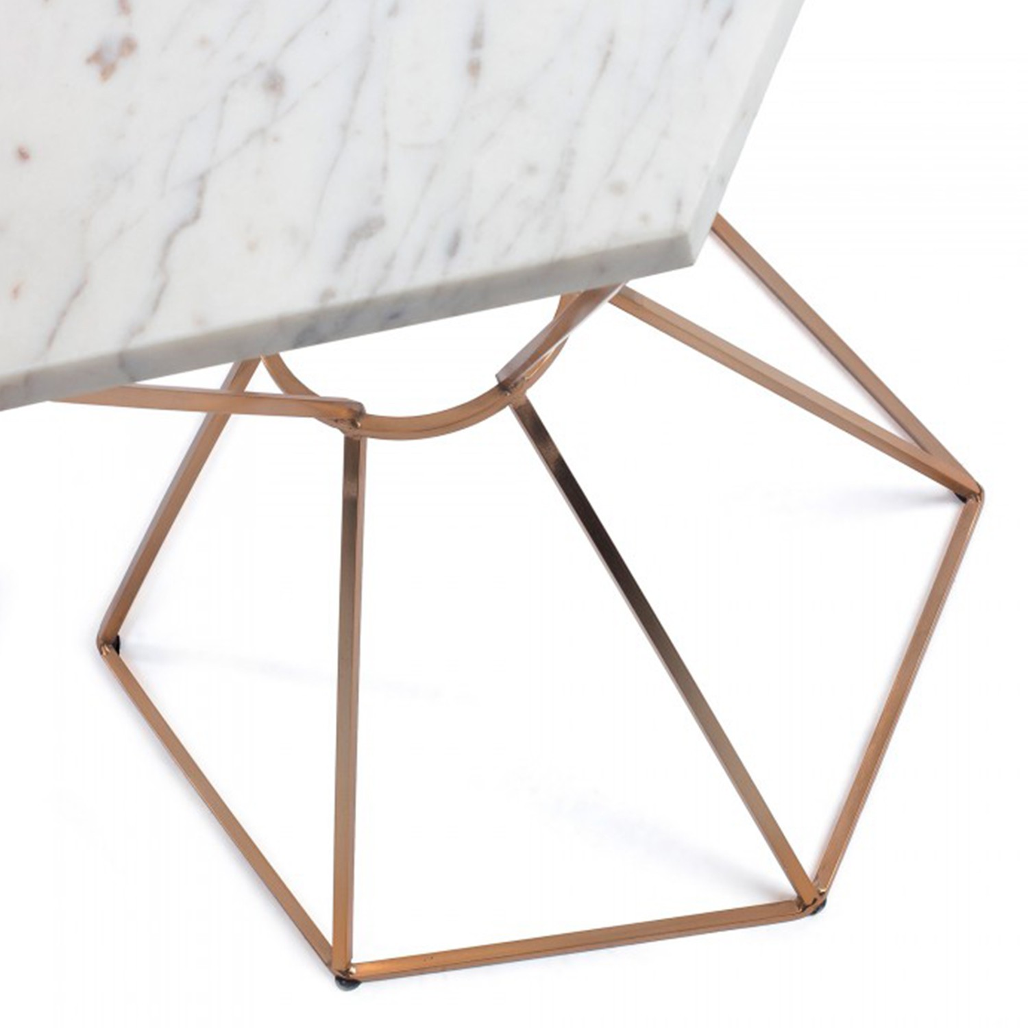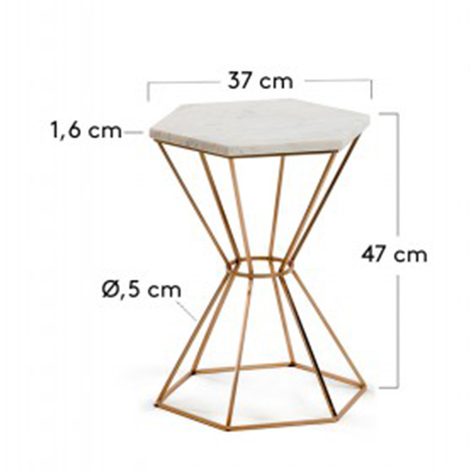 No es otra que la mesa auxiliar MASERU. Sus formas nos recuerdan al típico reloj de arena que todos alguna vez hemos podido ver. El diseño consta de un sobre en forma hexagonal fabricado en mármol mientras que la estructura que lo sostiene está hecho de metal en color cobre pintado mediante pulverización.