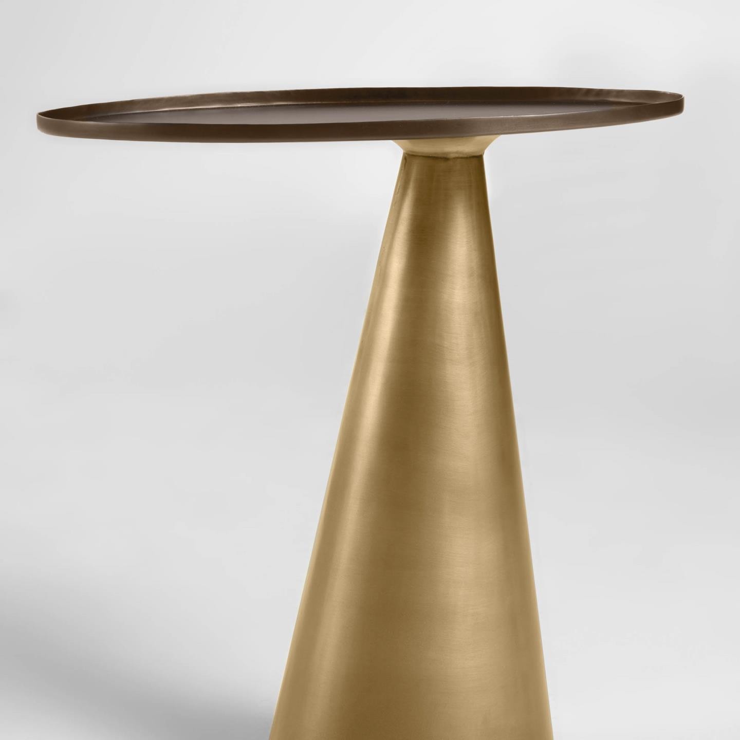 Hablamos de un modelo moderno, diseñado íntegramente en metal. La base, se presenta en forma cónica y en color dorado, siendo la parte más ancha la que encontraremos en la parte inferior, mientras que la estrecha es la encargada de sostener un sobre redondo, de 45 centímetros de diámetro y acabado en color negro.