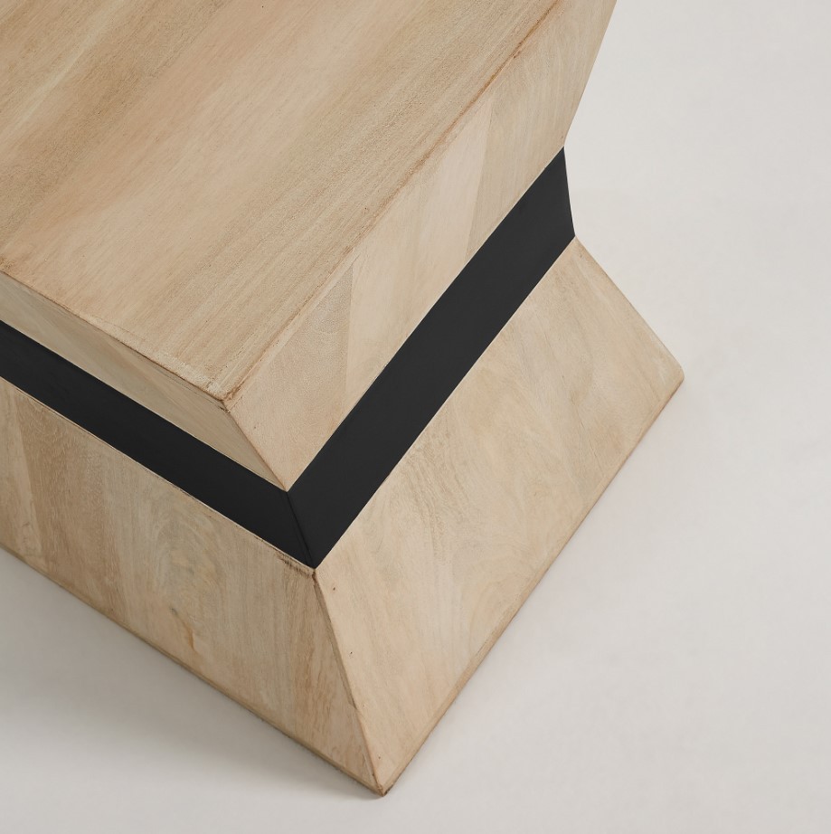 Por ello os presentamos la mesa auxiliar PACER. Se trata de un modelo que por su forma nos recuerda a un reloj de arena. De casi medio metro de altura, está realizada en madera maciza natural. En la zona central, encontramos una gran franja de color negro que rodea completamente dicha mesa y la divide en dos partes iguales.