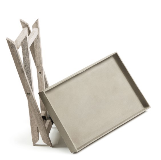 Pero vamos por faena. Primero de todo diremos que se trata de la mesa auxiliar SABADELL, un modelo que se puede dividir en dos materiales distintos que la forman. Por un lado la bandeja, de cemento, y por otro, la estructura, formada por cuatro patas cruzadas realizadas en madera de acacia.