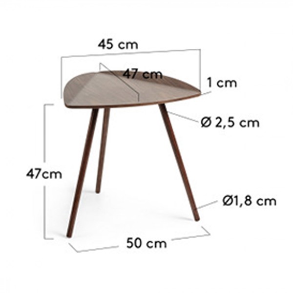 Se trata de un modelo que fusiona los estilos clásico y rústico dando lugar a una mesa compuesta por tres firmes patas diseñadas en madera chapada de nogal, y que se encargan de sostener un sobre semicircular realizado en el mismo material.