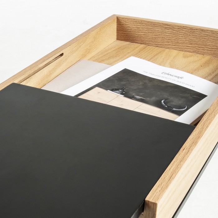Su diseño emplea el metal en color negro con la que está diseñada la estructura, consiguiendo así un mayor fortaleza y resistencia. Le acompaña un sobre realizado en madera chapada de roble natural, cubierto por una tapa lacada, también de color negro, y que permite ser deslizada para colocar en la posición que más nos interese.
