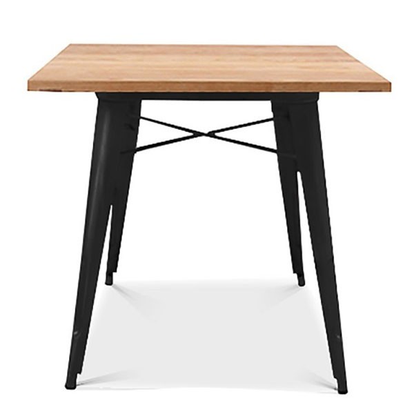 Su característica estructura de cuatro patas con unas varillas en forma de X que las une, está fabricada de acero con un tratamiento de fosfatado (previene la corrosión) y un acabado en pintura epoxi de color negro. El sobre cuadrado es de madera maciza de olmo con acabado natural.