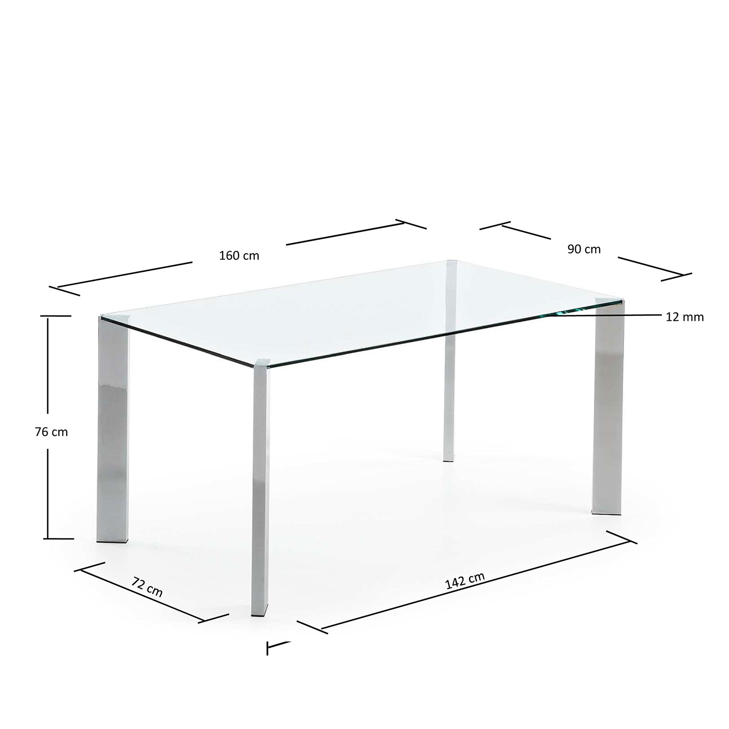 La mesa está formada por un sobre rectangular de vidrio templado el cual se apoya sobre una estructura de acero cromado muy elegante.