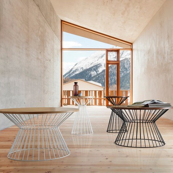 Un ejemplo es la mesa de centro ANTADA, un contraste de colores, puesto que mezcla el blanco de la chapa de madera que forma el sobre, de 80 centímetros de diámetro y el negro de la estructura, realizada mediante varillas de metal dando lugar a una jaula. Dicha estructura es estrecha en su parte central y más ancha tanto en la parte superior como en la inferior. Podríamos asemejarlo a la forma que tiene un reloj de arena.
