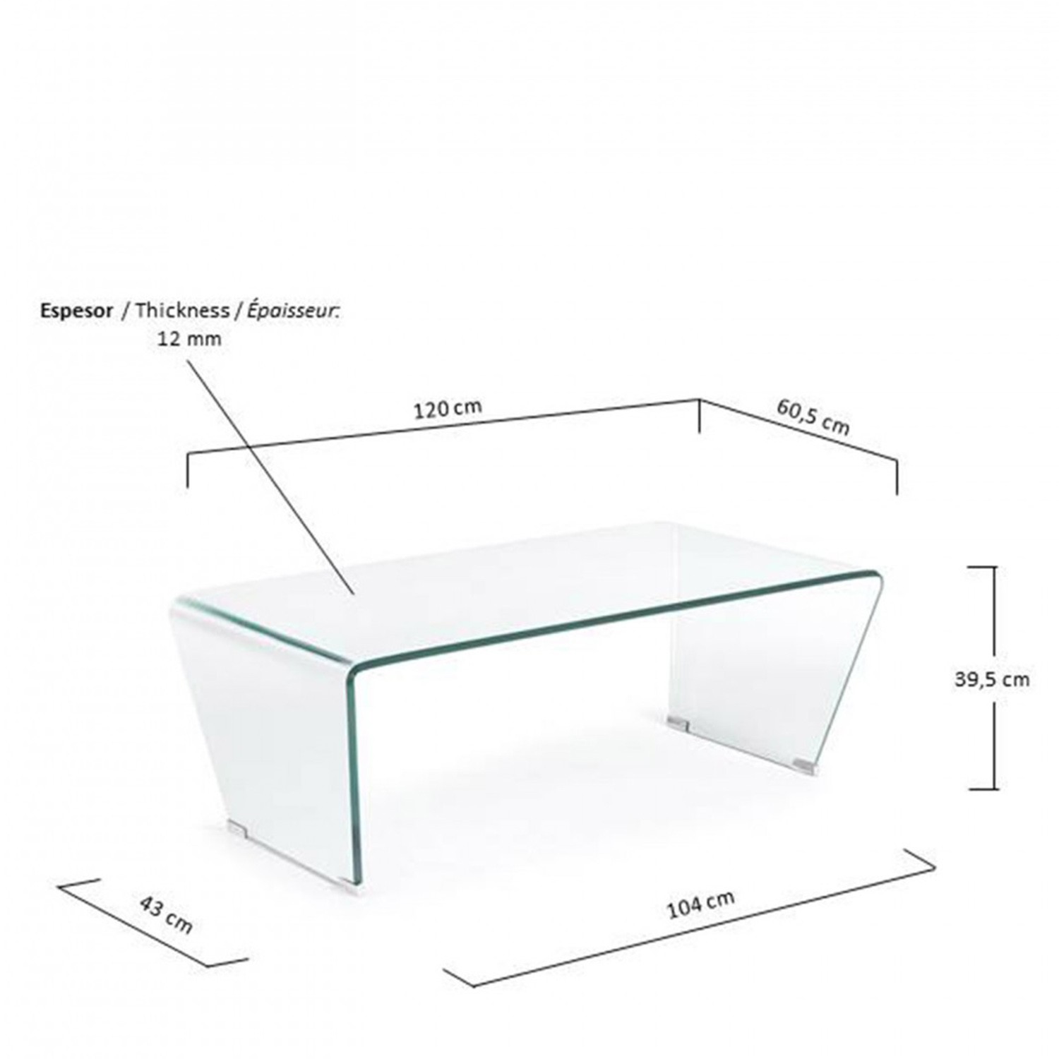 La mesa de centro BURANO GLASS tiene unas dimensiones de 120x60 centímetros y está diseñada en cristal curvado templado transparente. Incluye cuatro protecciones para evitar que el cristal se dañe con facilidad.