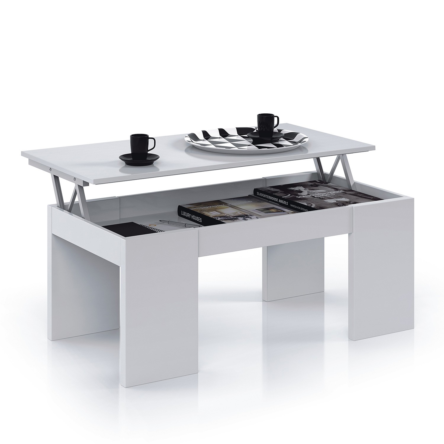 Gracias al mecanismo elevable esta mesa vale por dos, tanto de mesa de centro como de mesa de comedor donde disfrutar de tu comida o cena, sentado relajadamente en tu sofá delante del televisor. También dispone de un lugar para almacenaje de tus utensilios diarios.