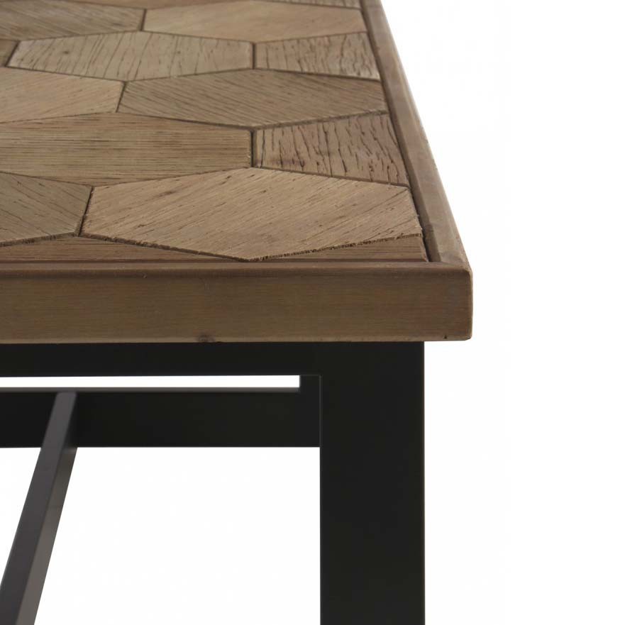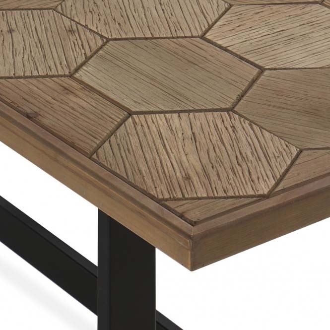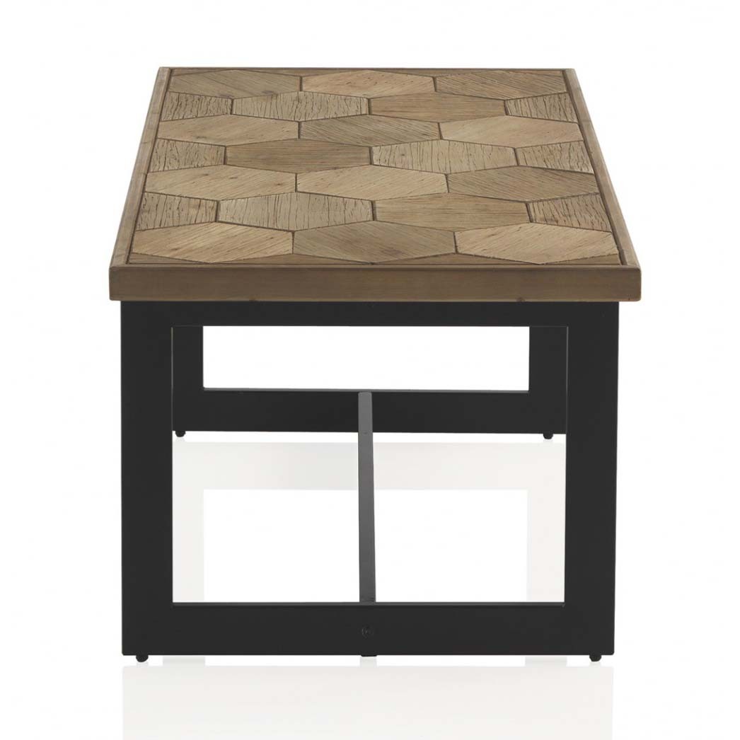 Mismamente, la mesa de centro HONEY esta formada por un tablero rectangular de 123x60 centímetros de madera de freno con un patrón de hexágonos impecable que se sostiene por unas patas metálicas de color negro. Un diseño bellísimo perfecto para hogares que quieran personalidad.