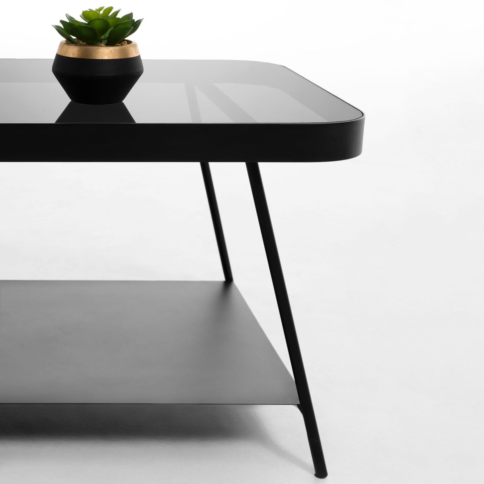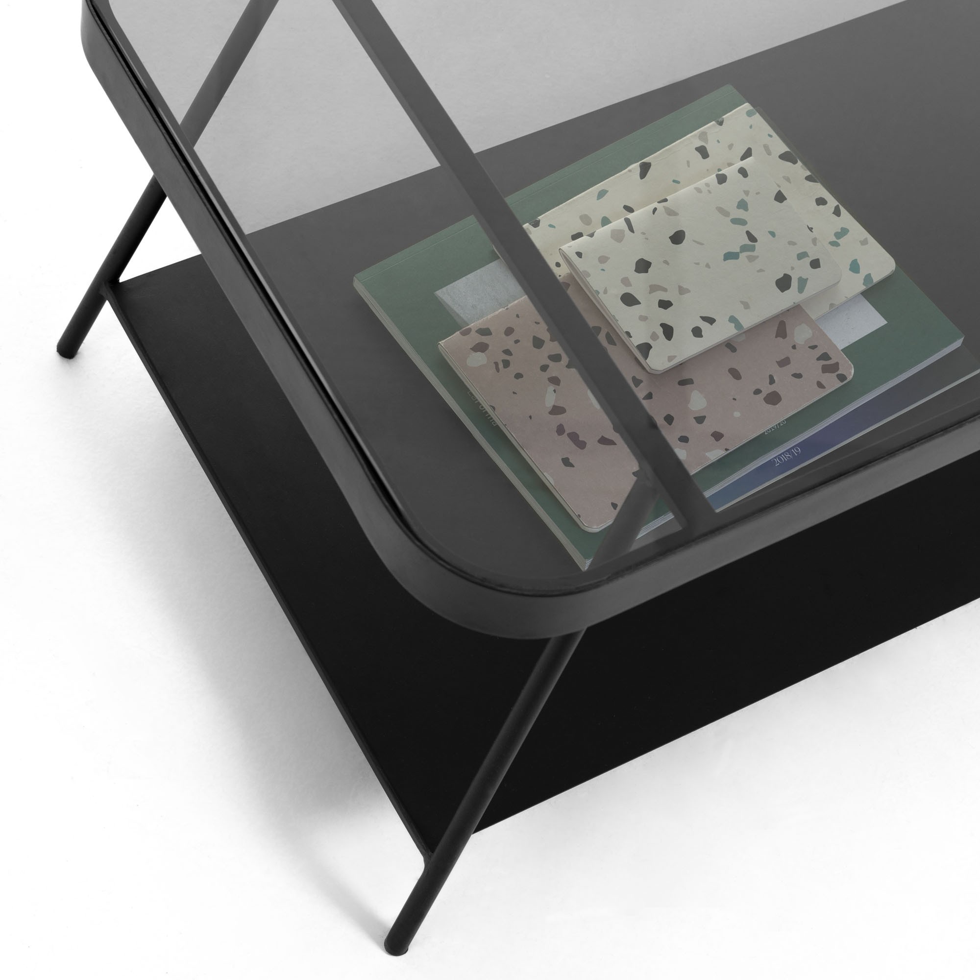 Formada por una estructura de metal en color negro, podemos dividirla en dos niveles distintos. Por un lado, el inferior, realizado en el mismo material que la estructura, mientras que el superior está formado por un gran cristal negro ahumado, presentado en forma rectangular.