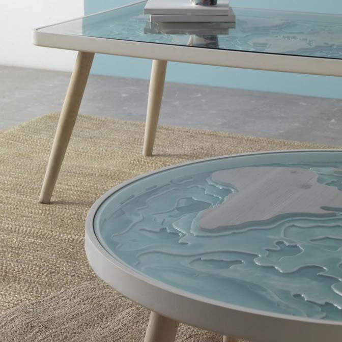 Su diseño redondo y original se constituye por un tablero de MDF representando con relieves el mapamundi, protegido por un sobre de cristal templado. Éste sustentado por unas patas de madera de abeto.