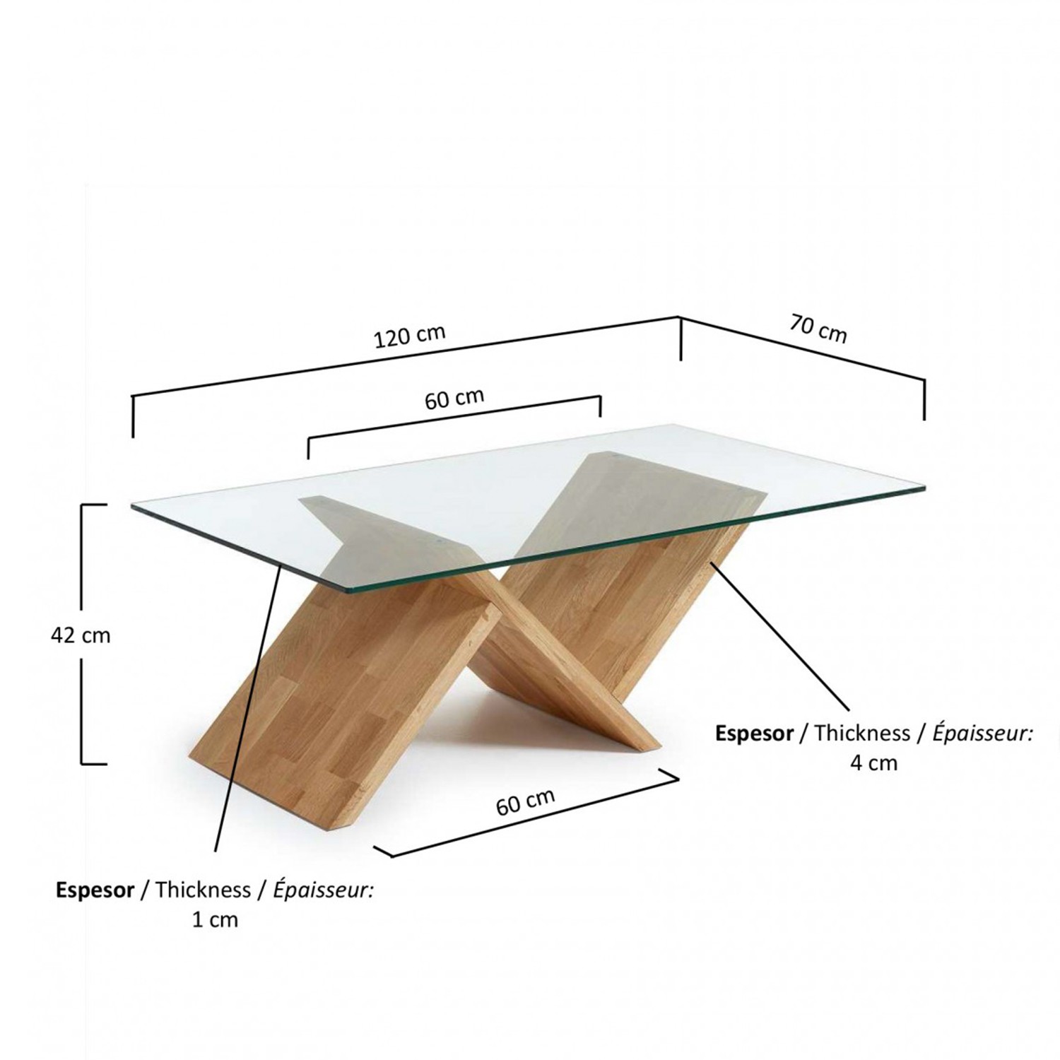 Por ello, queremos presentaros la mesa de centro POTENZA. Un modelo de forma rectangular, con un sobre de cristal transparente que se sostiene mediante un pie en forma de uve y otro pie en forma de uve invertida, todo ello diseñado en madera de roble macizo en estado natural.