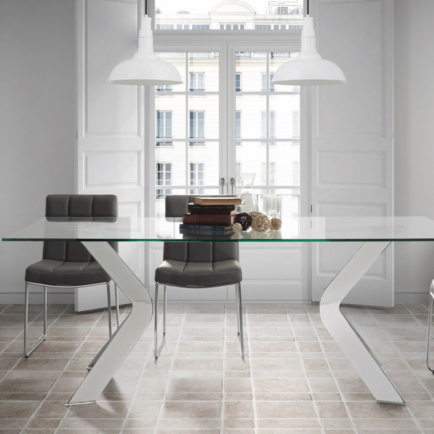 Su nombre es COPENHAGUE y consta de un sobre diseñado en cristal templado transparente que deberás cuidar puesto que es un material delicado. Le acompañan cuatro patas de acero cromado con un original diseño, dando lugar a una mesa seria, pero moderna a la vez.