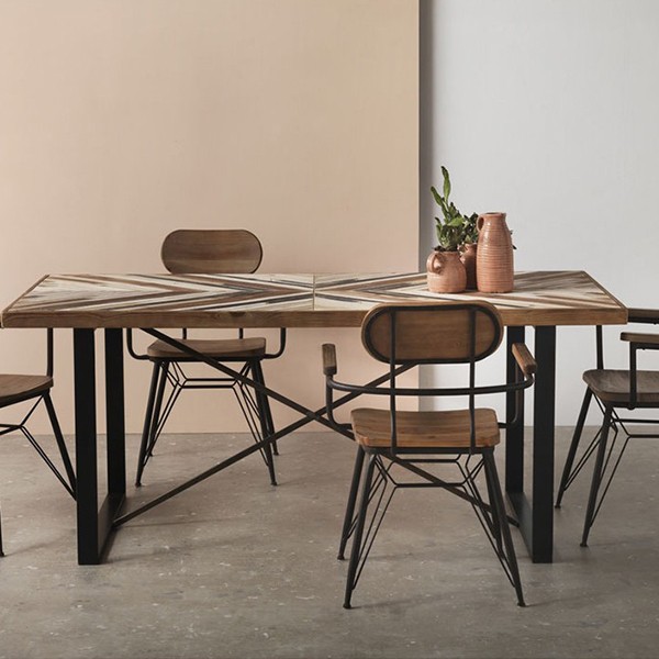 El sobre es de madera de abeto laminado, estando compuesto por listones de distintos colores. La estructura de la mesa de comedor ENYA está fabricada en metal de color negro reforzado en forma rectangular, sujeta al tablero. Como refuerzo y mayor estabilidad lleva una cruceta metálica del bajo del travesaño de las patas hacia la parte superior.