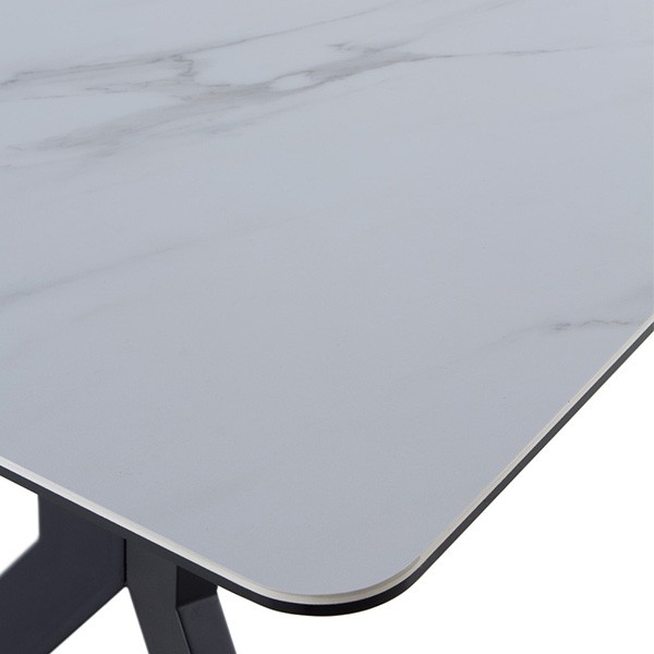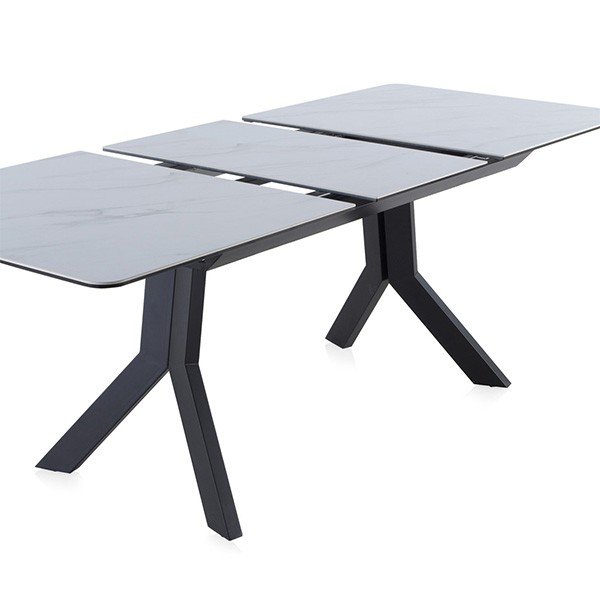 Consta de un sobre rectangular que, de los 160 centímetros iniciales, supera los dos metros de longitud cuando se encuentra totalmente extendida. Este sobre es de cerámica, aunque simula parecer mármol acabado en color blanco. Se sostiene gracias a dos parejas de patas realizadas en metal negro y con las que se consigue tener una gran estabilidad.