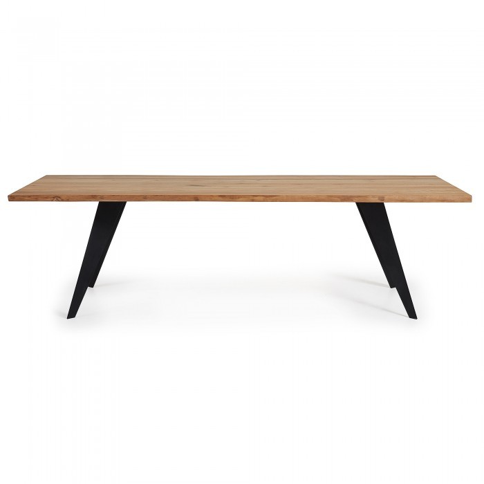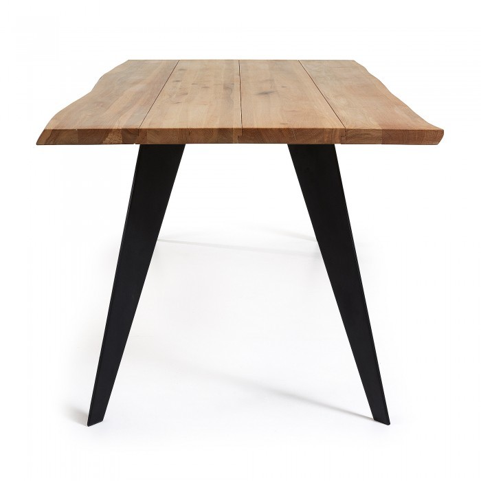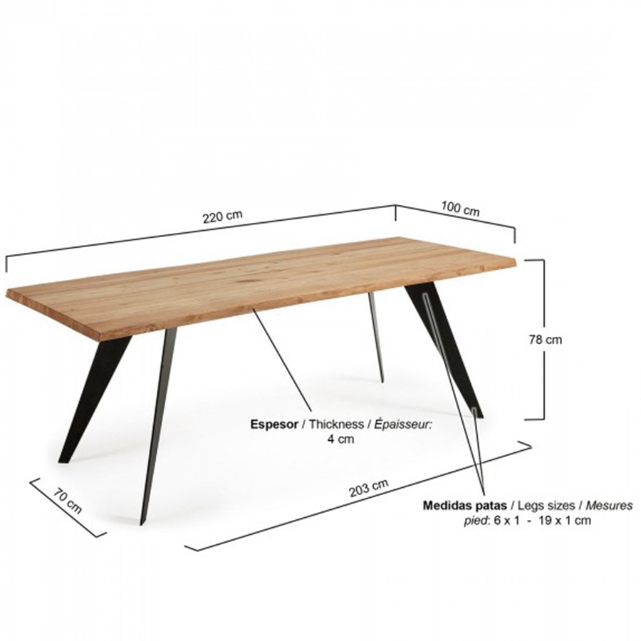 Y cuando decimos grande lo hacemos tanto por sus dimensiones como por su calidad. De forma rectangular, supera con creces los dos metros de longitud, y consta de un sobre diseñado en madera de roble natural con un acabado encerado. Acompañándole, encontramos cuatro patas diseñadas en metal pintado en color negro.