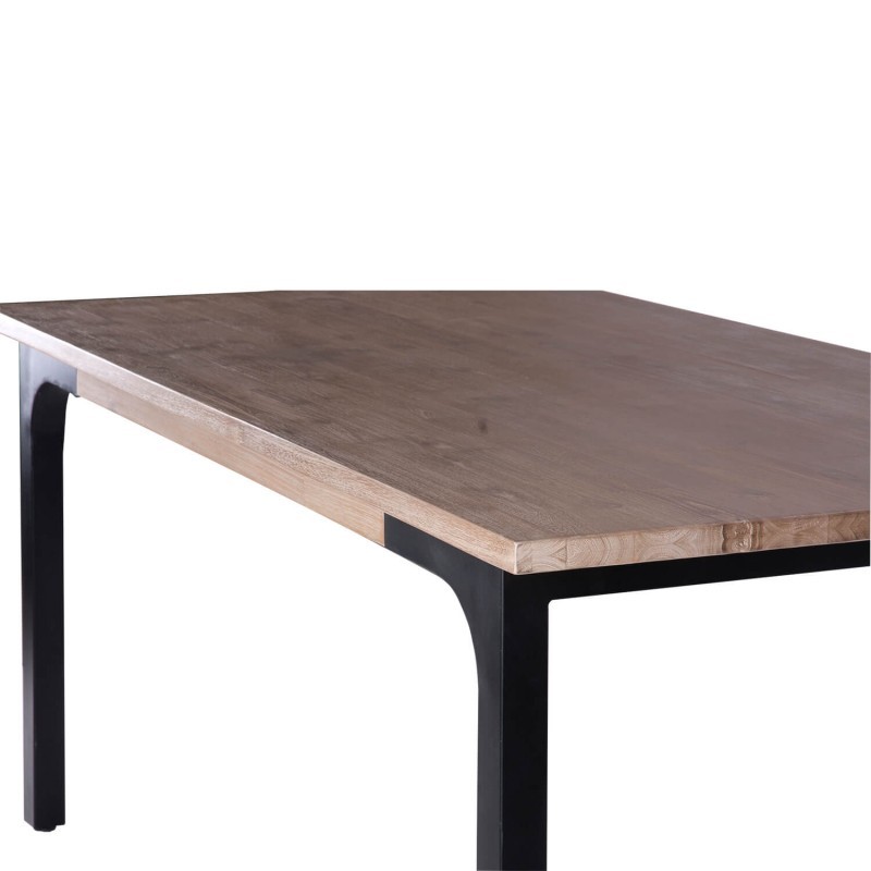 Pertenece a la colección TAKINU y se trata de una mesa de comedor rectangular que consta de un sobre macizo realizado en madera de acacia natural, reforzado en su cara interior y que se soporta gracias a cuatro patas cuadradas de 5 centímetros de grosor, realizadas en metal en acabado negro mate.