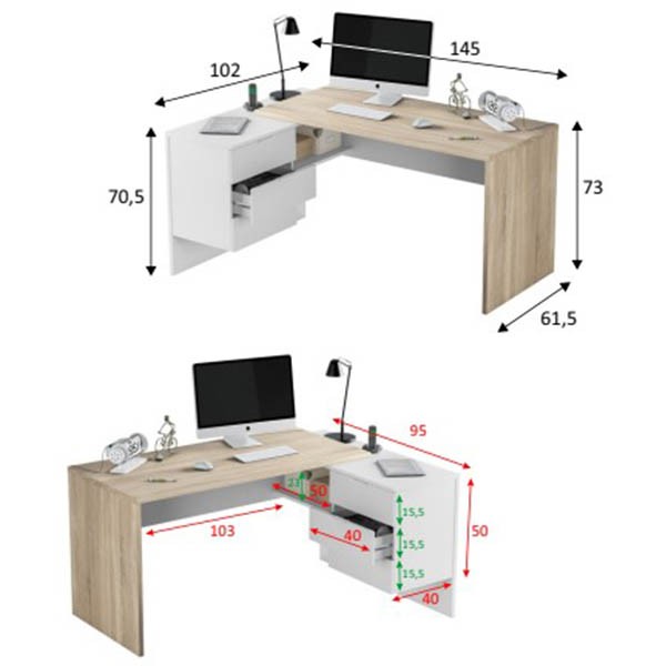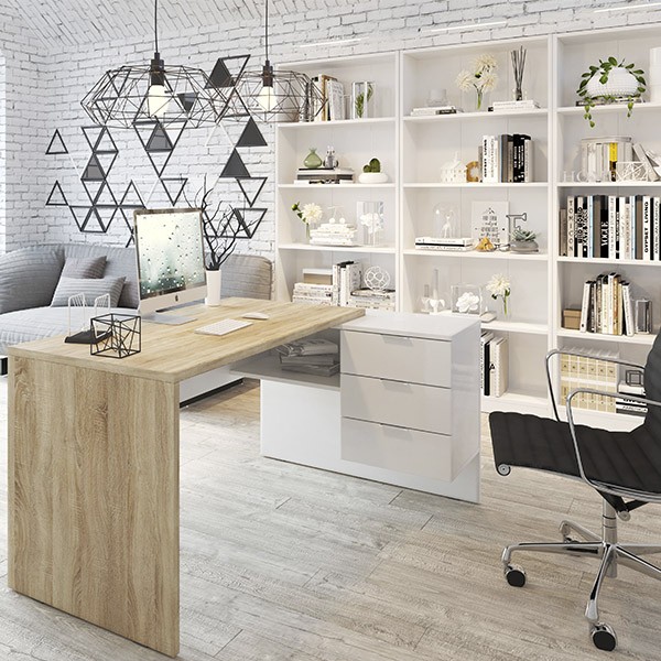 Esta mesa fabricada en melamina de color blanco artik y roble canadian dispone de una mesa central y una auxiliar en forma de bus o cajonera que aporta una ayuda extra para almacenaje o color lo necesario mantener el orden en el trabajo en la mesa principal. El buc dispone de tres cajones de almacenaje y estante para que puedas colocar las herramientas necesarias para facilitarte el trabajo.