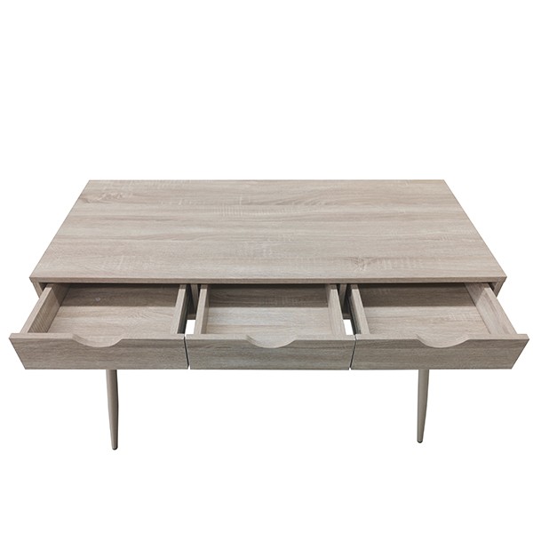 Está formado por un sobre diseñado en melamina de color roble, con tres cajones de almacenaje, y patas metálicas par una mayor resistencia y durabilidad, también en tonalidad roble.