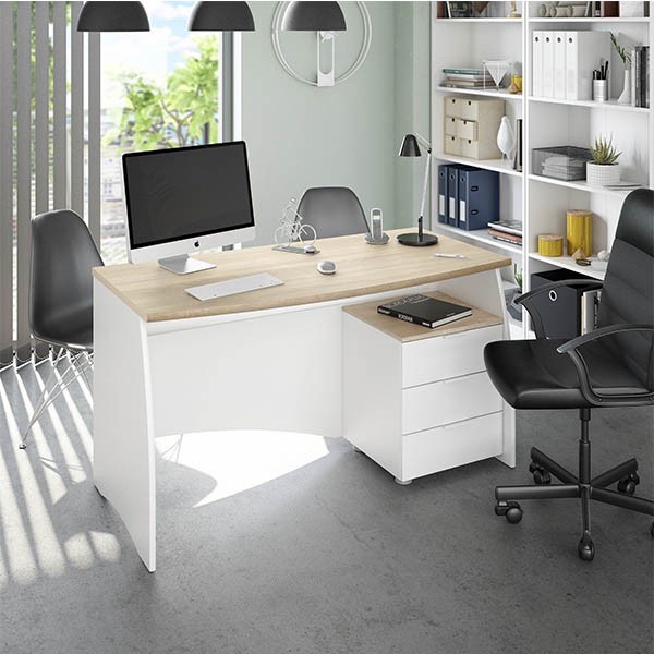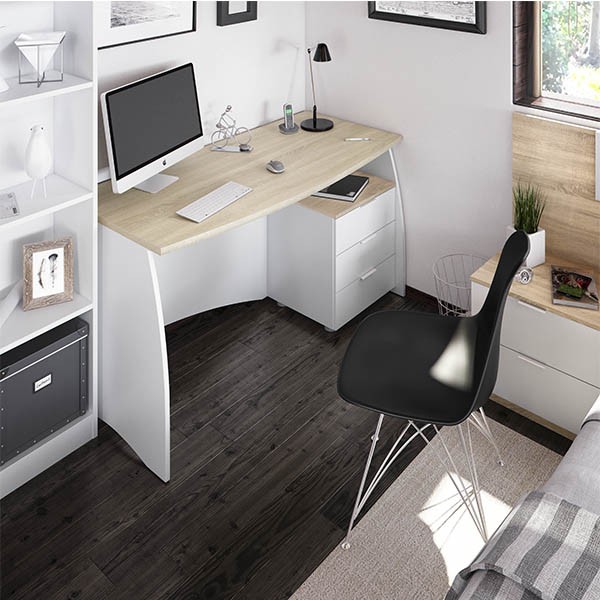 Fabricada en melamina blanca de tonalidad artik y sobre de color roble canadian. Esta mesa escritorio es la herramienta ideal que no debes dejar de obtener para tu hogar o negocio, estudio, oficina, despacho... ya sea para estancias de estilo casual, clásico, nórdico.