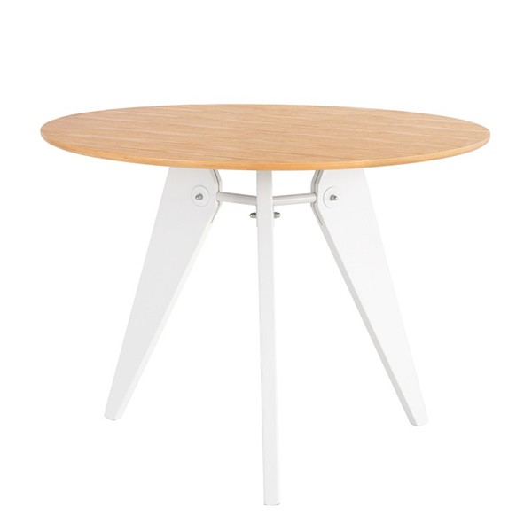 Hablamos de una mesa de comedor que nos recuerda al diseño de JEAN PROUVE, un diseño con unas patas muy originales de un diseño diferente, que rompe con lo convencional. Su sobre de forma circular chapado en roble natural aporta calidez al ambiente, y junto a sus patas de madera en blanco darán ese toque puro y limpio. Perfecta para ambientes nórdicos y modernos.