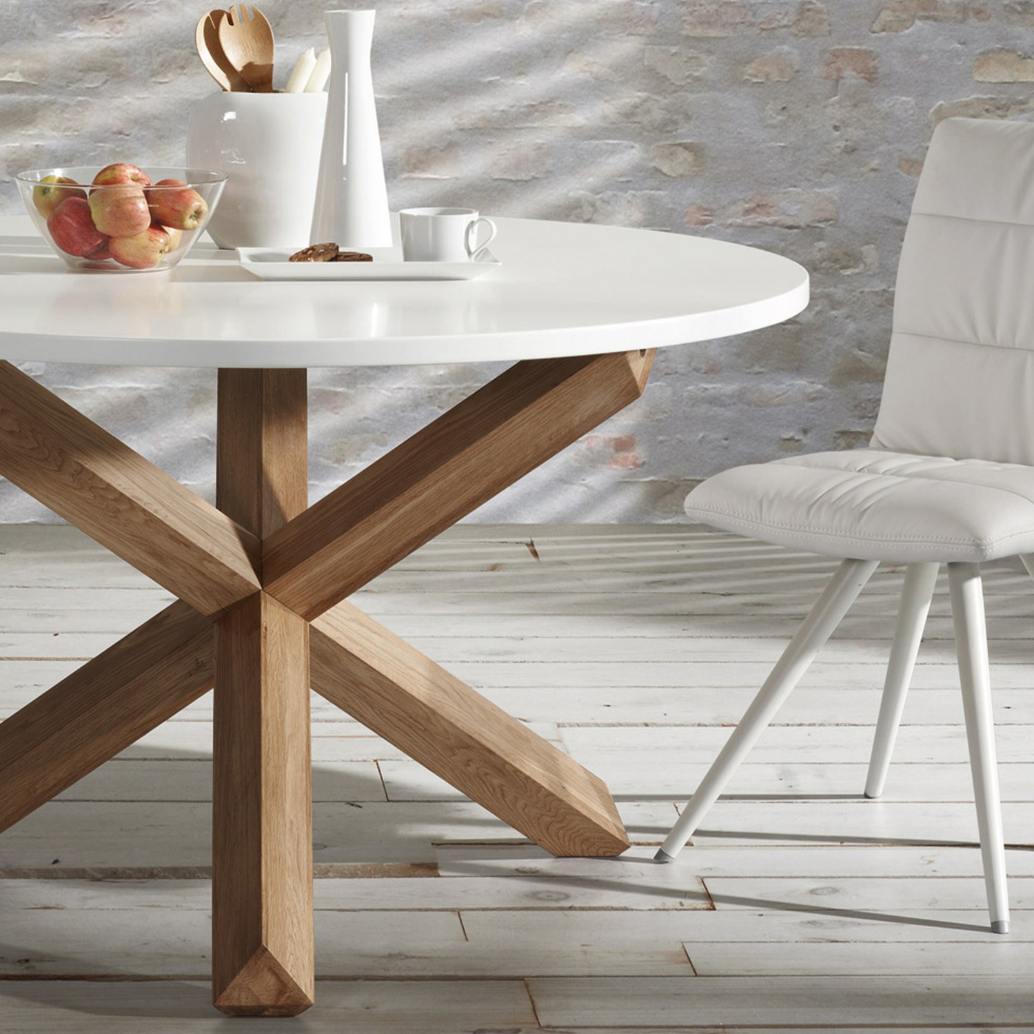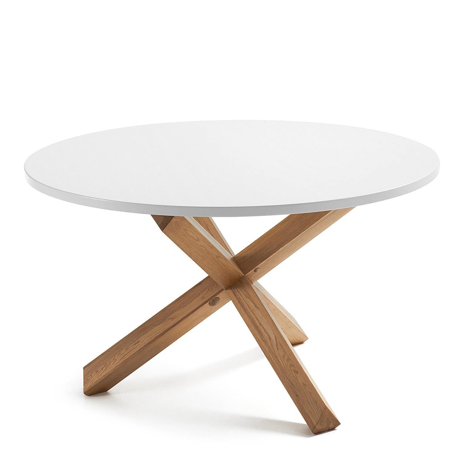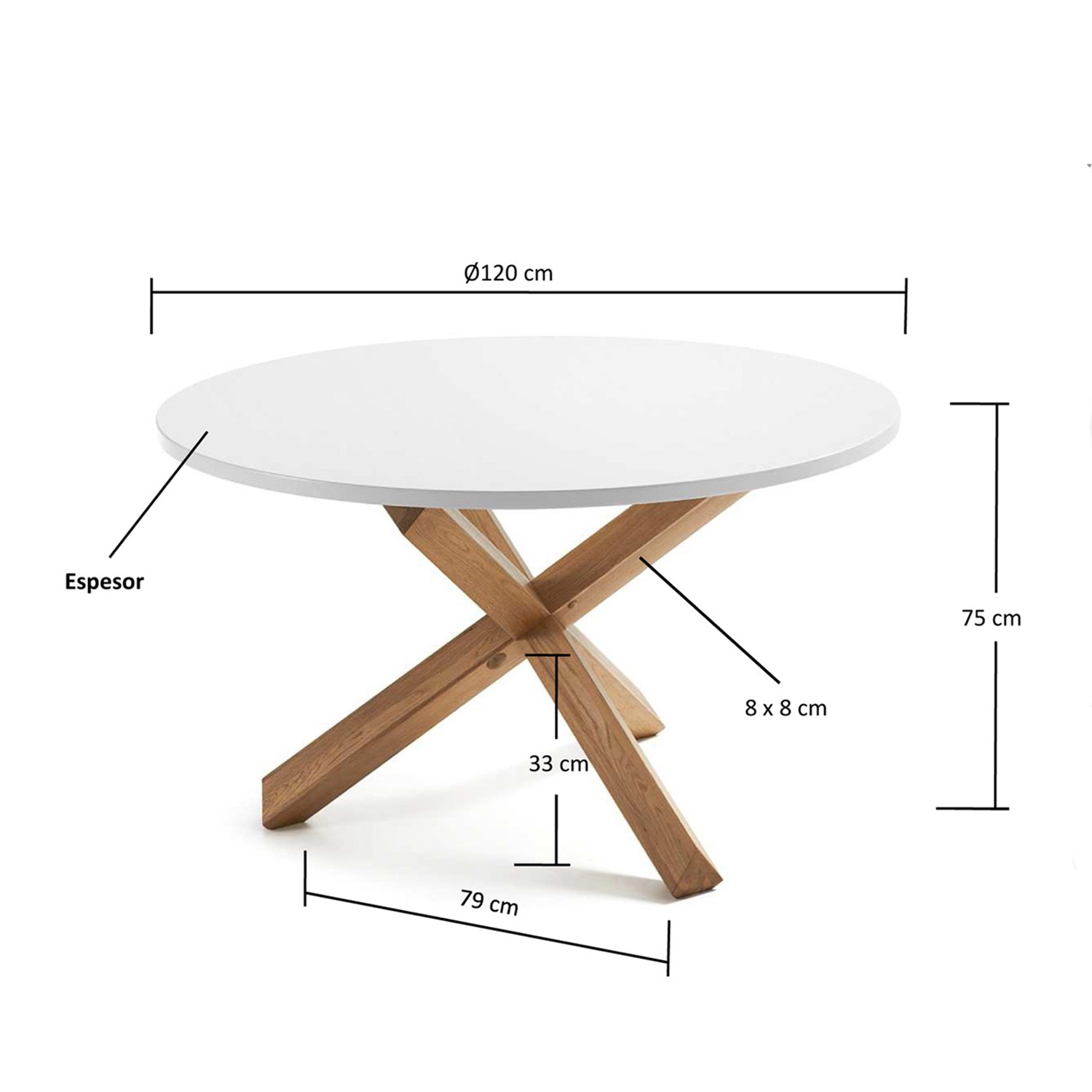 Una superficie de DM blanco mate ultra resistente de 120 cm de diámetro te permitirá limpiar la mesa de forma práctica con trapo húmedo.