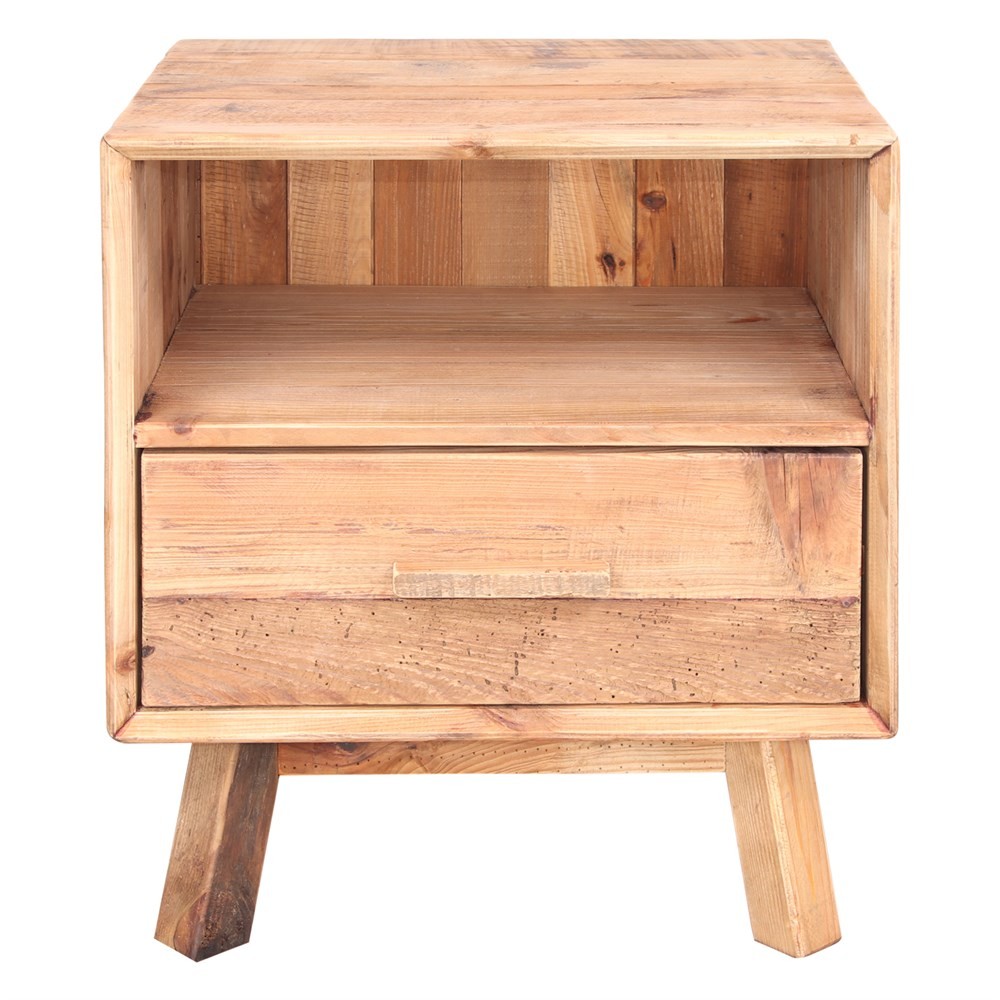 De estilo rustico, está diseñada y fabricada en su totalidad en madera de pino reciclado. Consta de cuatro patas que la elevan unos centímetros del suelo, tiene un cajón para el almacenaje y un estante para poner objetos de decoración como fotos, cuadros, plantas, cajas de luz...