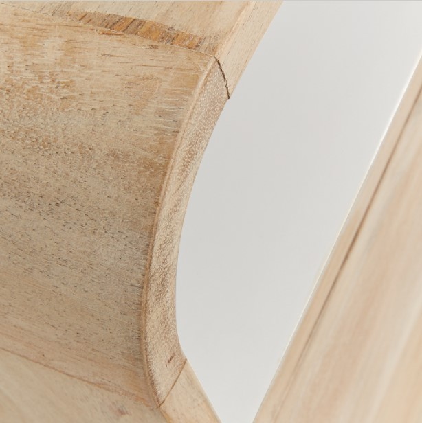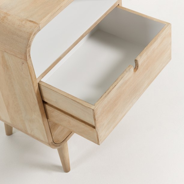 Una mesa de noche en la que encontramos una estructura diseñada en madera de mango macizo natural. Cuenta con dos cajones en su parte inferior mientras que, encima de éstos, encontramos un espacio que también nos servirá para almacenar ciertos objetos. Este último hueco, está acabado en lacado de color blanco.