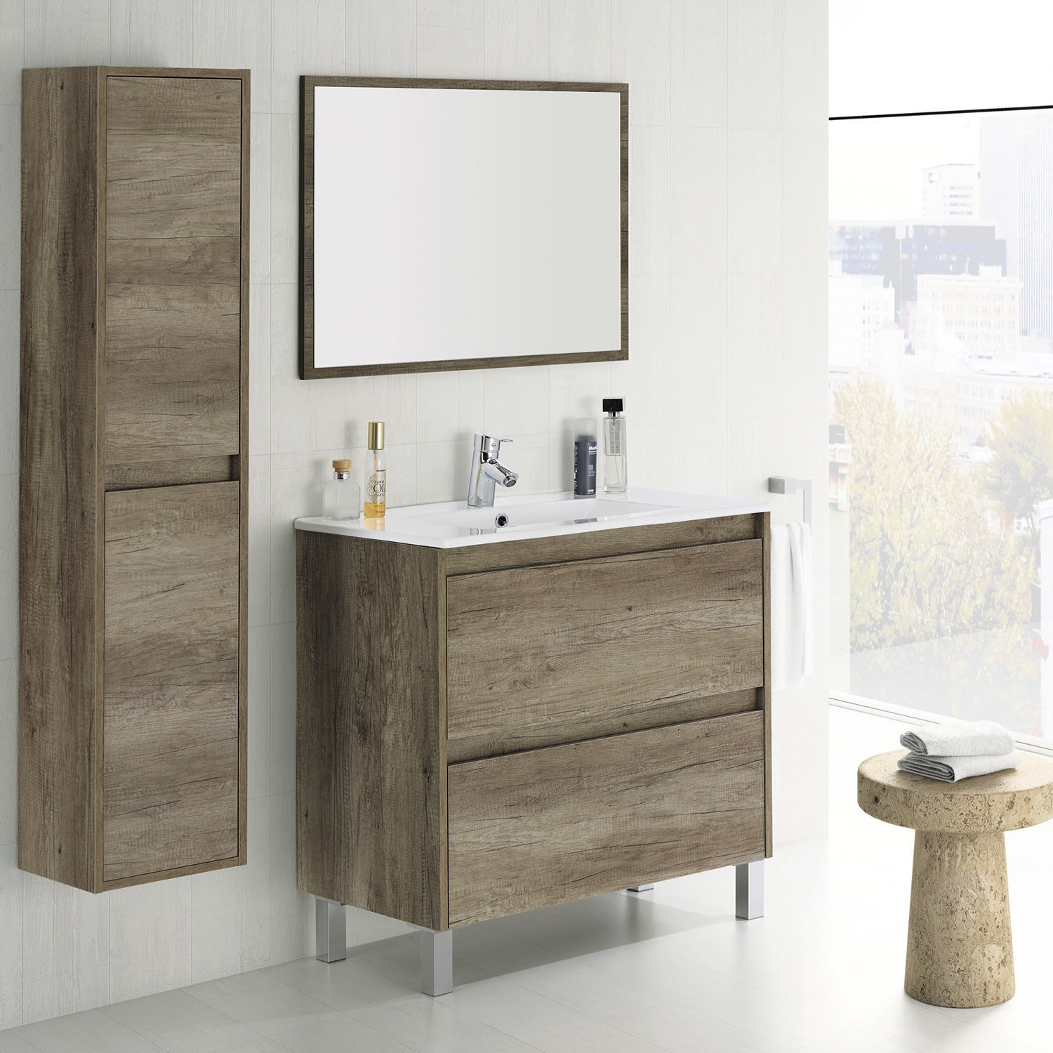El mueble armario de baño para colgar ALVARO se fabrica en melamina de excelentes calidades en efecto madera rústica que muestra calidez y buen gusto en un mueble de baño de altas prestaciones.