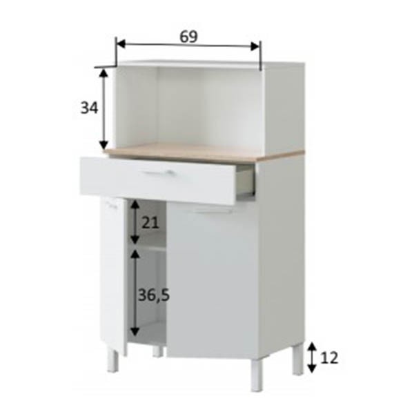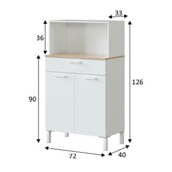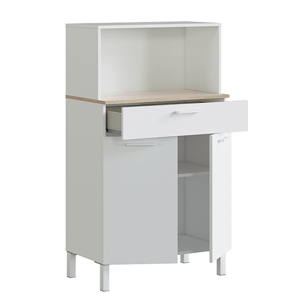 Está compuesto por un hueco, estante, para el microondas, un cajón y armario de doble puerta para almacenaje, ya sea para una despensa o para utensilios para un office: tazas, vasos, cucharas, botes...