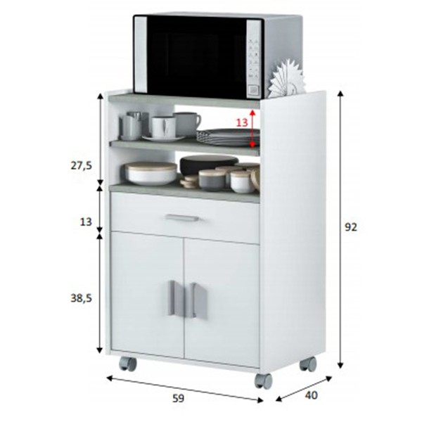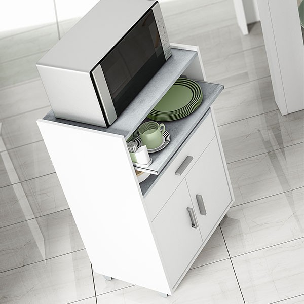Está realizado en melamina de color blanco y estantes en color gris cemento, uno de ellos es tipo bandeja deslizante, además de cajón y un armario de doble puerta con tiradores ABS para almacenaje. También dispone de ruedas ABS (termoplástico y resistentes) para colocarlo donde lo necesites.