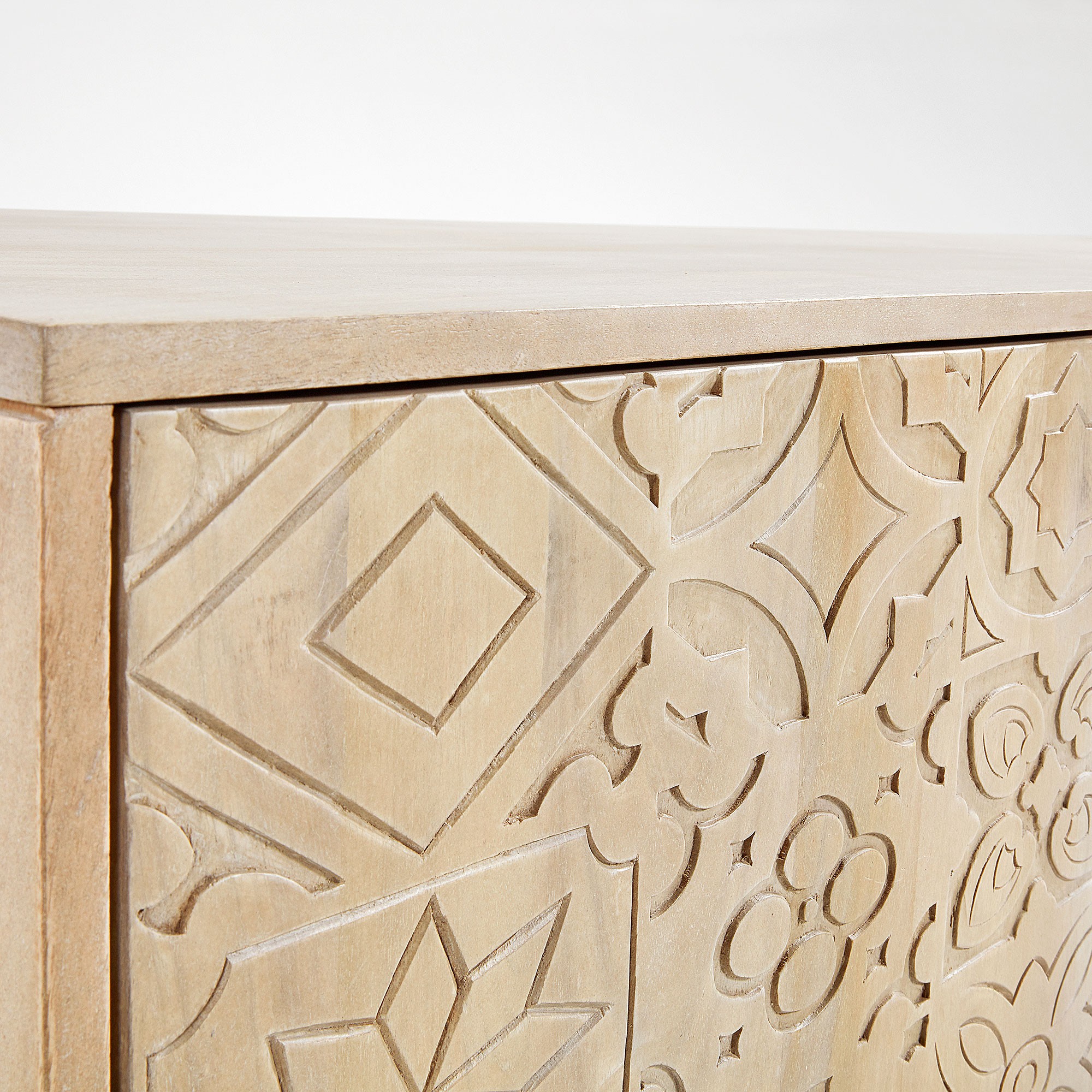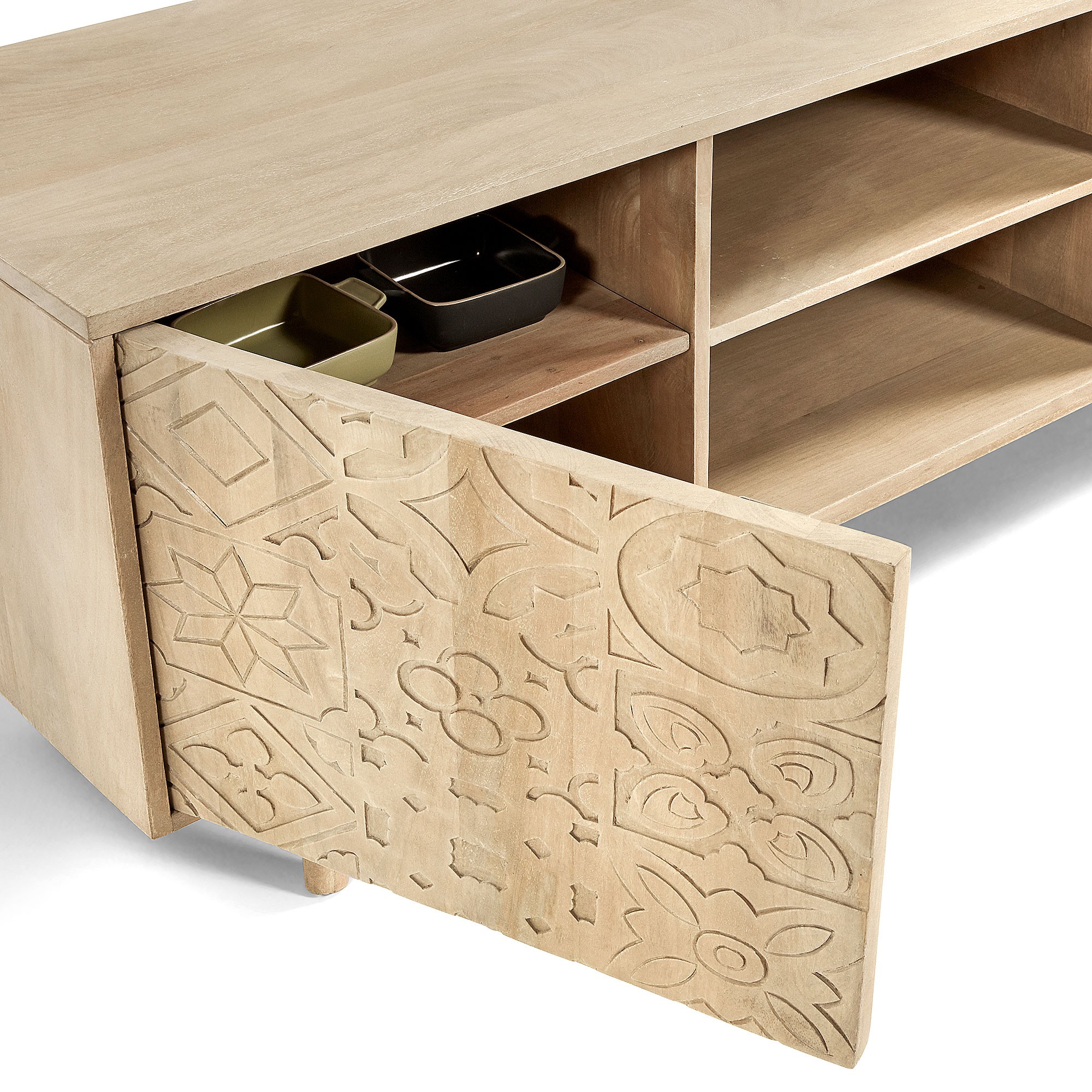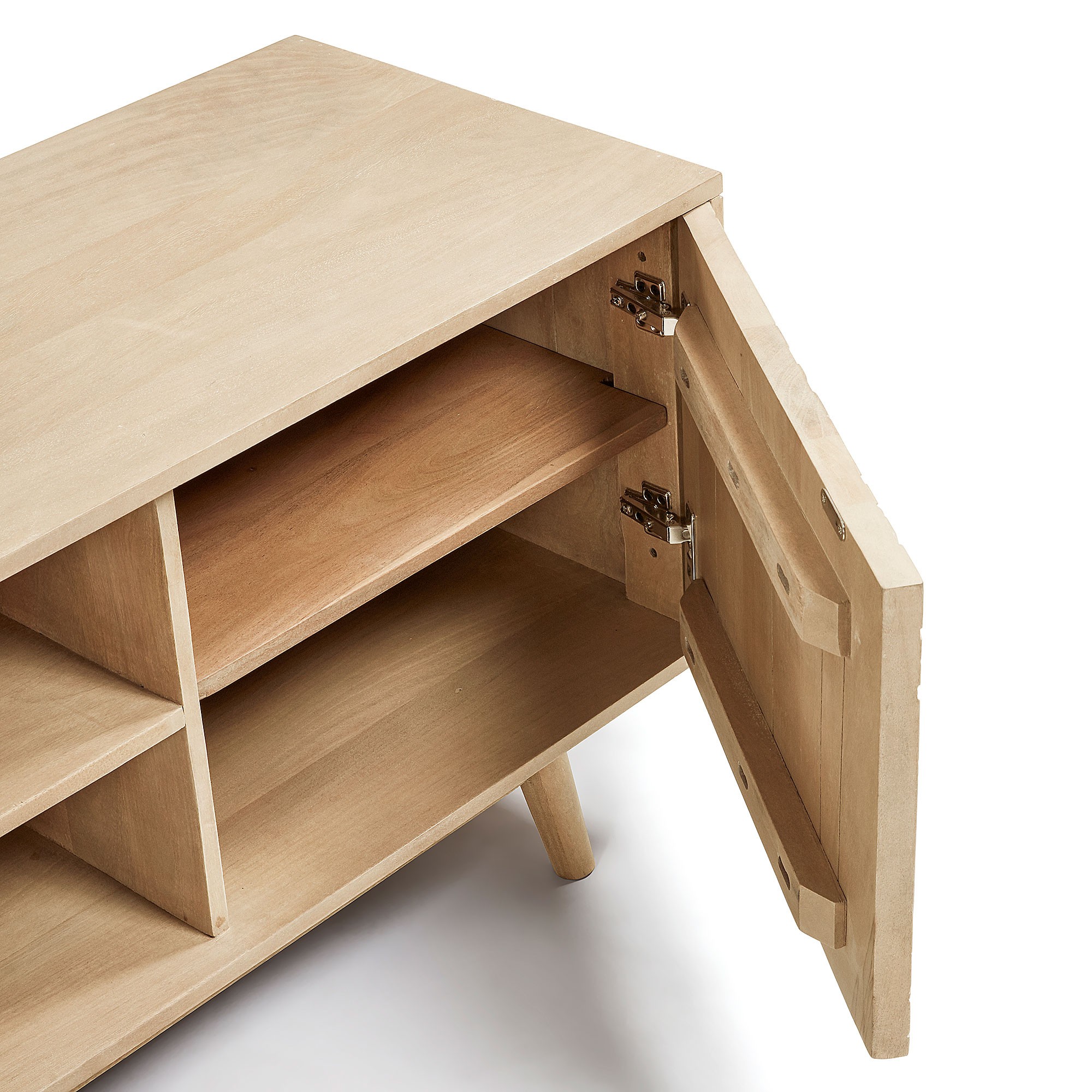 Así que no hay mejor ubicación que colocarla sobre el mueble de TV HAMBURGO, un mueble de estilo tropical cuya realización utiliza, en su totalidad, la madera maciza de mango en acabado natural.