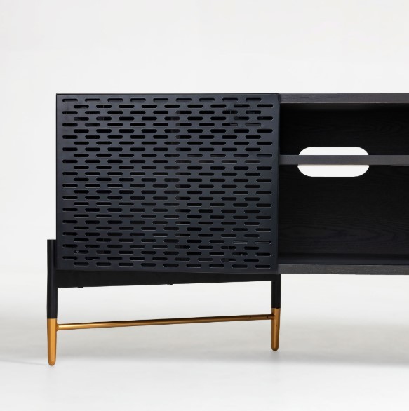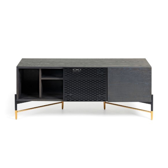 Por ello el mueble de TV IBIZA se convierte en una estupenda elección, dada su funcionalidad y sus prestaciones. Consta de una estructura diseñada en chapa de madera de fresno, a la que le acompañan dos puertas, una de ellas corredera y diseñada en rejilla metálica con diferentes compartimentos de tamaños variados y concluyendo en unos pies metálicos que se encargan de sostener el peso de todo el mueble.