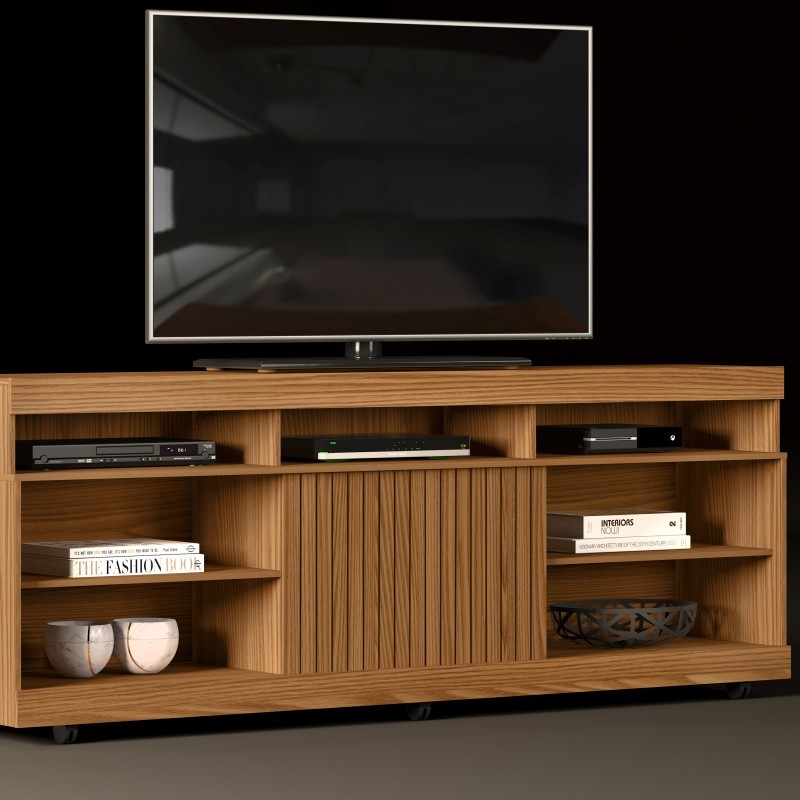 Su fabricación cuenta con un acabado efecto roble, dispone de prácticas ruedas que le permitirá desplazarla con facilidad. El mueble de TV MIRLO está compuesto de estantes extraíbles donde podrás mantener en orden toda clase de accesorios utilizados con regularidad en el salón o comedor: mandos, DVD’s, revistas, libros o cualquier elemento de decoración. También dispone de una puerta corredera con molduras decorativas.